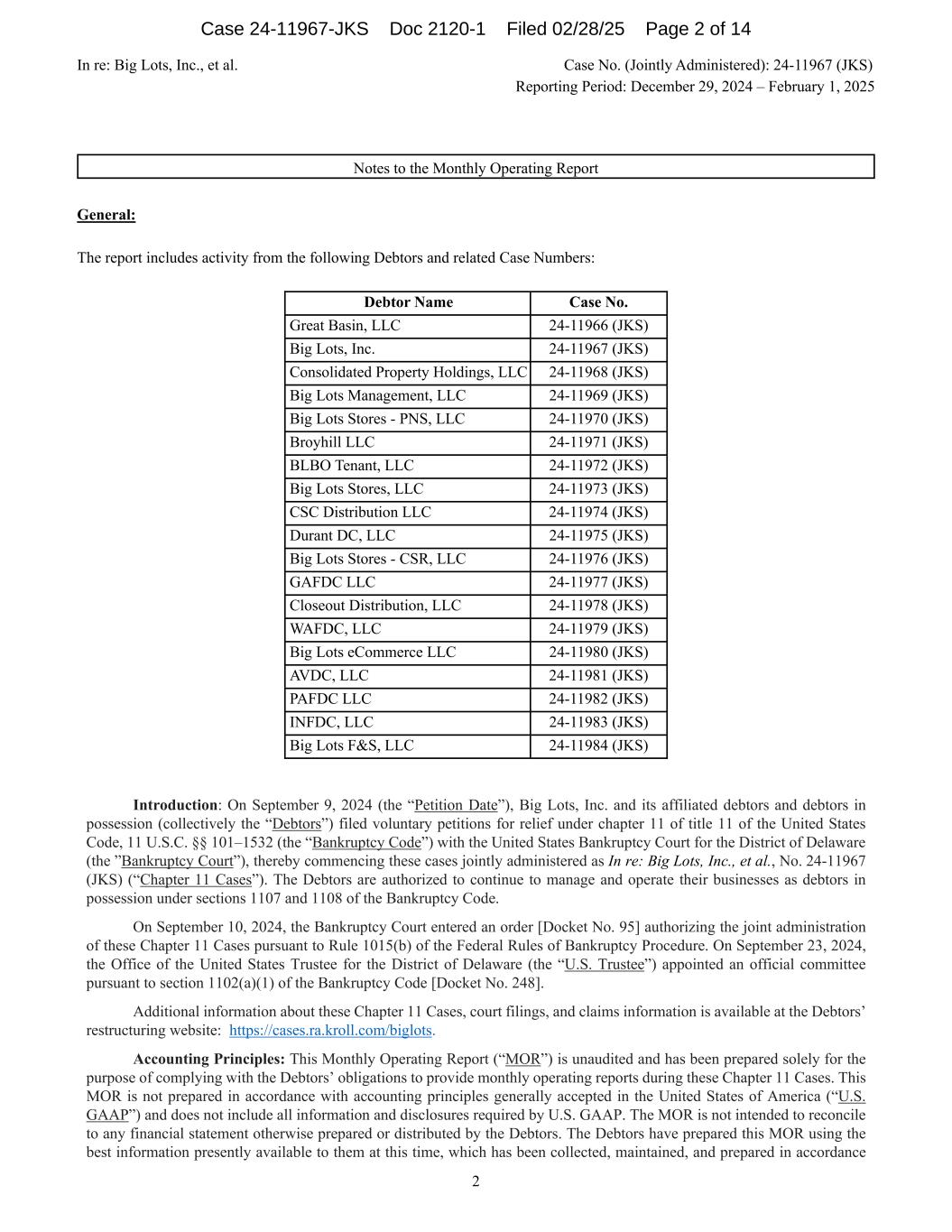 In re: Big Lots, Inc., et al. Case No. (Jointly Administered): 24-11967 (JKS) Reporting Period: December 29, 2024 – February 1, 2025 2 Notes to the Monthly Operating Report General: The report includes activity from the following Debtors and related Case Numbers: Debtor Name Case No. Great Basin, LLC 24-11966 (JKS) Big Lots, Inc. 24-11967 (JKS) Consolidated Property Holdings, LLC 24-11968 (JKS) Big Lots Management, LLC 24-11969 (JKS) Big Lots Stores - PNS, LLC 24-11970 (JKS) Broyhill LLC 24-11971 (JKS) BLBO Tenant, LLC 24-11972 (JKS) Big Lots Stores, LLC 24-11973 (JKS) CSC Distribution LLC 24-11974 (JKS) Durant DC, LLC 24-11975 (JKS) Big Lots Stores - CSR, LLC 24-11976 (JKS) GAFDC LLC 24-11977 (JKS) Closeout Distribution, LLC 24-11978 (JKS) WAFDC, LLC 24-11979 (JKS) Big Lots eCommerce LLC 24-11980 (JKS) AVDC, LLC 24-11981 (JKS) PAFDC LLC 24-11982 (JKS) INFDC, LLC 24-11983 (JKS) Big Lots F&S, LLC 24-11984 (JKS) Introduction: On September 9, 2024 (the “Petition Date”), Big Lots, Inc. and its affiliated debtors and debtors in possession (collectively the “Debtors”) filed voluntary petitions for relief under chapter 11 of title 11 of the United States Code, 11 U.S.C. §§ 101–1532 (the “Bankruptcy Code”) with the United States Bankruptcy Court for the District of Delaware (the ”Bankruptcy Court”), thereby commencing these cases jointly administered as In re: Big Lots, Inc., et al., No. 24-11967 (JKS) (“Chapter 11 Cases”). The Debtors are authorized to continue to manage and operate their businesses as debtors in possession under sections 1107 and 1108 of the Bankruptcy Code. On September 10, 2024, the Bankruptcy Court entered an order [Docket No. 95] authorizing the joint administration of these Chapter 11 Cases pursuant to Rule 1015(b) of the Federal Rules of Bankruptcy Procedure. On September 23, 2024, the Office of the United States Trustee for the District of Delaware (the “U.S. Trustee”) appointed an official committee pursuant to section 1102(a)(1) of the Bankruptcy Code [Docket No. 248]. Additional information about these Chapter 11 Cases, court filings, and claims information is available at the Debtors’ restructuring website: https://cases.ra.kroll.com/biglots. Accounting Principles: This Monthly Operating Report (“MOR”) is unaudited and has been prepared solely for the purpose of complying with the Debtors’ obligations to provide monthly operating reports during these Chapter 11 Cases. This MOR is not prepared in accordance with accounting principles generally accepted in the United States of America (“U.S. GAAP”) and does not include all information and disclosures required by U.S. GAAP. The MOR is not intended to reconcile to any financial statement otherwise prepared or distributed by the Debtors. The Debtors have prepared this MOR using the best information presently available to them at this time, which has been collected, maintained, and prepared in accordance Case 24-11967-JKS Doc 2120-1 Filed 02/28/25 Page 2 of 14