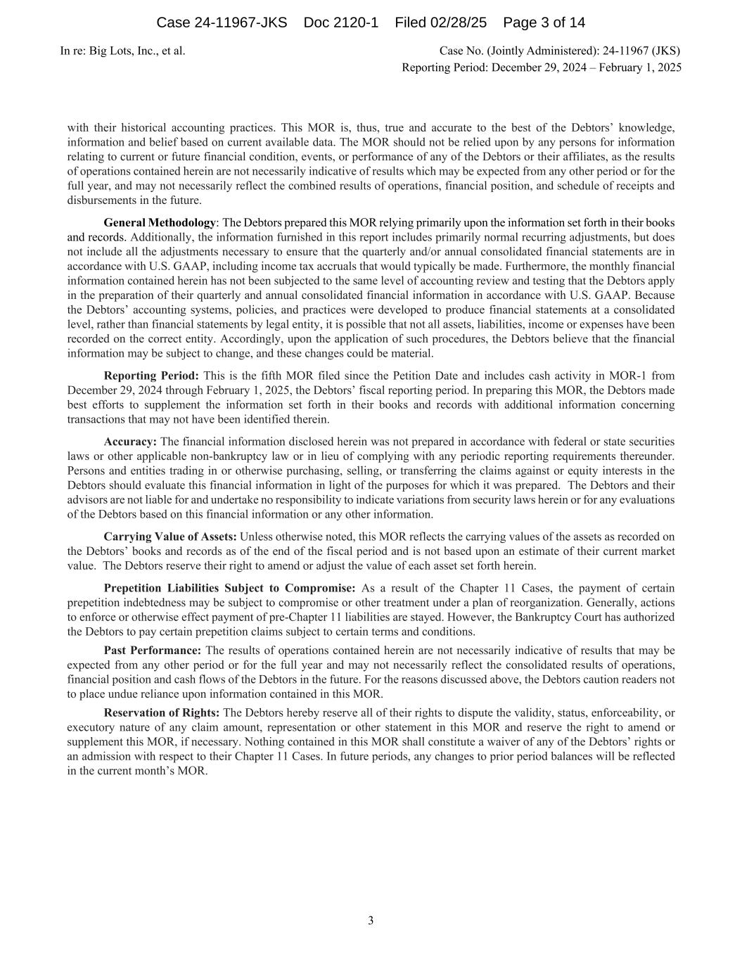 In re: Big Lots, Inc., et al. Case No. (Jointly Administered): 24-11967 (JKS) Reporting Period: December 29, 2024 – February 1, 2025 3 with their historical accounting practices. This MOR is, thus, true and accurate to the best of the Debtors’ knowledge, information and belief based on current available data. The MOR should not be relied upon by any persons for information relating to current or future financial condition, events, or performance of any of the Debtors or their affiliates, as the results of operations contained herein are not necessarily indicative of results which may be expected from any other period or for the full year, and may not necessarily reflect the combined results of operations, financial position, and schedule of receipts and disbursements in the future. General Methodology: The Debtors prepared this MOR relying primarily upon the information set forth in their books and records. Additionally, the information furnished in this report includes primarily normal recurring adjustments, but does not include all the adjustments necessary to ensure that the quarterly and/or annual consolidated financial statements are in accordance with U.S. GAAP, including income tax accruals that would typically be made. Furthermore, the monthly financial information contained herein has not been subjected to the same level of accounting review and testing that the Debtors apply in the preparation of their quarterly and annual consolidated financial information in accordance with U.S. GAAP. Because the Debtors’ accounting systems, policies, and practices were developed to produce financial statements at a consolidated level, rather than financial statements by legal entity, it is possible that not all assets, liabilities, income or expenses have been recorded on the correct entity. Accordingly, upon the application of such procedures, the Debtors believe that the financial information may be subject to change, and these changes could be material. Reporting Period: This is the fifth MOR filed since the Petition Date and includes cash activity in MOR-1 from December 29, 2024 through February 1, 2025, the Debtors’ fiscal reporting period. In preparing this MOR, the Debtors made best efforts to supplement the information set forth in their books and records with additional information concerning transactions that may not have been identified therein. Accuracy: The financial information disclosed herein was not prepared in accordance with federal or state securities laws or other applicable non-bankruptcy law or in lieu of complying with any periodic reporting requirements thereunder. Persons and entities trading in or otherwise purchasing, selling, or transferring the claims against or equity interests in the Debtors should evaluate this financial information in light of the purposes for which it was prepared. The Debtors and their advisors are not liable for and undertake no responsibility to indicate variations from security laws herein or for any evaluations of the Debtors based on this financial information or any other information. Carrying Value of Assets: Unless otherwise noted, this MOR reflects the carrying values of the assets as recorded on the Debtors’ books and records as of the end of the fiscal period and is not based upon an estimate of their current market value. The Debtors reserve their right to amend or adjust the value of each asset set forth herein. Prepetition Liabilities Subject to Compromise: As a result of the Chapter 11 Cases, the payment of certain prepetition indebtedness may be subject to compromise or other treatment under a plan of reorganization. Generally, actions to enforce or otherwise effect payment of pre-Chapter 11 liabilities are stayed. However, the Bankruptcy Court has authorized the Debtors to pay certain prepetition claims subject to certain terms and conditions. Past Performance: The results of operations contained herein are not necessarily indicative of results that may be expected from any other period or for the full year and may not necessarily reflect the consolidated results of operations, financial position and cash flows of the Debtors in the future. For the reasons discussed above, the Debtors caution readers not to place undue reliance upon information contained in this MOR. Reservation of Rights: The Debtors hereby reserve all of their rights to dispute the validity, status, enforceability, or executory nature of any claim amount, representation or other statement in this MOR and reserve the right to amend or supplement this MOR, if necessary. Nothing contained in this MOR shall constitute a waiver of any of the Debtors’ rights or an admission with respect to their Chapter 11 Cases. In future periods, any changes to prior period balances will be reflected in the current month’s MOR. Case 24-11967-JKS Doc 2120-1 Filed 02/28/25 Page 3 of 14