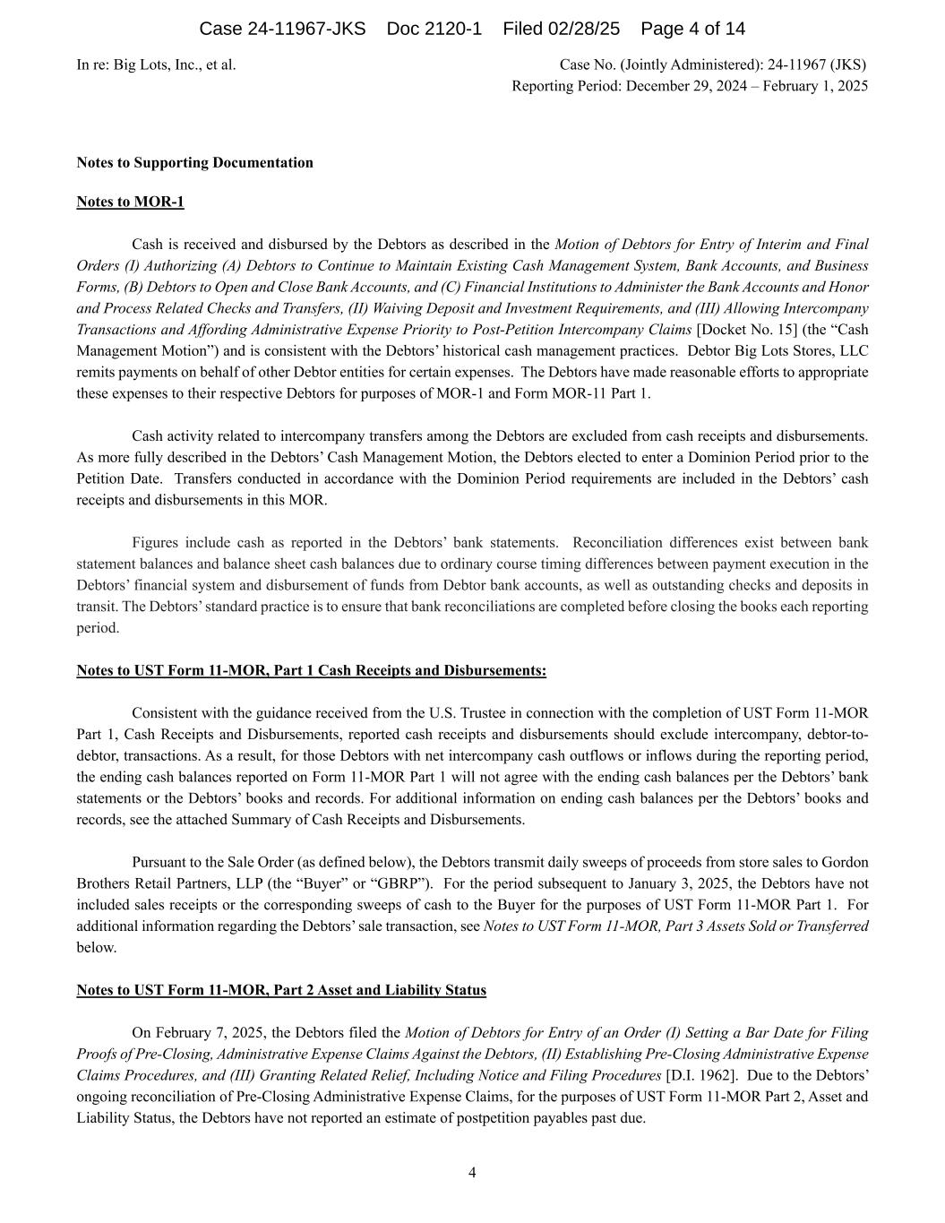 In re: Big Lots, Inc., et al. Case No. (Jointly Administered): 24-11967 (JKS) Reporting Period: December 29, 2024 – February 1, 2025 4 Notes to Supporting Documentation Notes to MOR-1 Cash is received and disbursed by the Debtors as described in the Motion of Debtors for Entry of Interim and Final Orders (I) Authorizing (A) Debtors to Continue to Maintain Existing Cash Management System, Bank Accounts, and Business Forms, (B) Debtors to Open and Close Bank Accounts, and (C) Financial Institutions to Administer the Bank Accounts and Honor and Process Related Checks and Transfers, (II) Waiving Deposit and Investment Requirements, and (III) Allowing Intercompany Transactions and Affording Administrative Expense Priority to Post-Petition Intercompany Claims [Docket No. 15] (the “Cash Management Motion”) and is consistent with the Debtors’ historical cash management practices. Debtor Big Lots Stores, LLC remits payments on behalf of other Debtor entities for certain expenses. The Debtors have made reasonable efforts to appropriate these expenses to their respective Debtors for purposes of MOR-1 and Form MOR-11 Part 1. Cash activity related to intercompany transfers among the Debtors are excluded from cash receipts and disbursements. As more fully described in the Debtors’ Cash Management Motion, the Debtors elected to enter a Dominion Period prior to the Petition Date. Transfers conducted in accordance with the Dominion Period requirements are included in the Debtors’ cash receipts and disbursements in this MOR. Figures include cash as reported in the Debtors’ bank statements. Reconciliation differences exist between bank statement balances and balance sheet cash balances due to ordinary course timing differences between payment execution in the Debtors’ financial system and disbursement of funds from Debtor bank accounts, as well as outstanding checks and deposits in transit. The Debtors’ standard practice is to ensure that bank reconciliations are completed before closing the books each reporting period. Notes to UST Form 11-MOR, Part 1 Cash Receipts and Disbursements: Consistent with the guidance received from the U.S. Trustee in connection with the completion of UST Form 11-MOR Part 1, Cash Receipts and Disbursements, reported cash receipts and disbursements should exclude intercompany, debtor-to- debtor, transactions. As a result, for those Debtors with net intercompany cash outflows or inflows during the reporting period, the ending cash balances reported on Form 11-MOR Part 1 will not agree with the ending cash balances per the Debtors’ bank statements or the Debtors’ books and records. For additional information on ending cash balances per the Debtors’ books and records, see the attached Summary of Cash Receipts and Disbursements. Pursuant to the Sale Order (as defined below), the Debtors transmit daily sweeps of proceeds from store sales to Gordon Brothers Retail Partners, LLP (the “Buyer” or “GBRP”). For the period subsequent to January 3, 2025, the Debtors have not included sales receipts or the corresponding sweeps of cash to the Buyer for the purposes of UST Form 11-MOR Part 1. For additional information regarding the Debtors’ sale transaction, see Notes to UST Form 11-MOR, Part 3 Assets Sold or Transferred below. Notes to UST Form 11-MOR, Part 2 Asset and Liability Status On February 7, 2025, the Debtors filed the Motion of Debtors for Entry of an Order (I) Setting a Bar Date for Filing Proofs of Pre-Closing, Administrative Expense Claims Against the Debtors, (II) Establishing Pre-Closing Administrative Expense Claims Procedures, and (III) Granting Related Relief, Including Notice and Filing Procedures [D.I. 1962]. Due to the Debtors’ ongoing reconciliation of Pre-Closing Administrative Expense Claims, for the purposes of UST Form 11-MOR Part 2, Asset and Liability Status, the Debtors have not reported an estimate of postpetition payables past due. Case 24-11967-JKS Doc 2120-1 Filed 02/28/25 Page 4 of 14