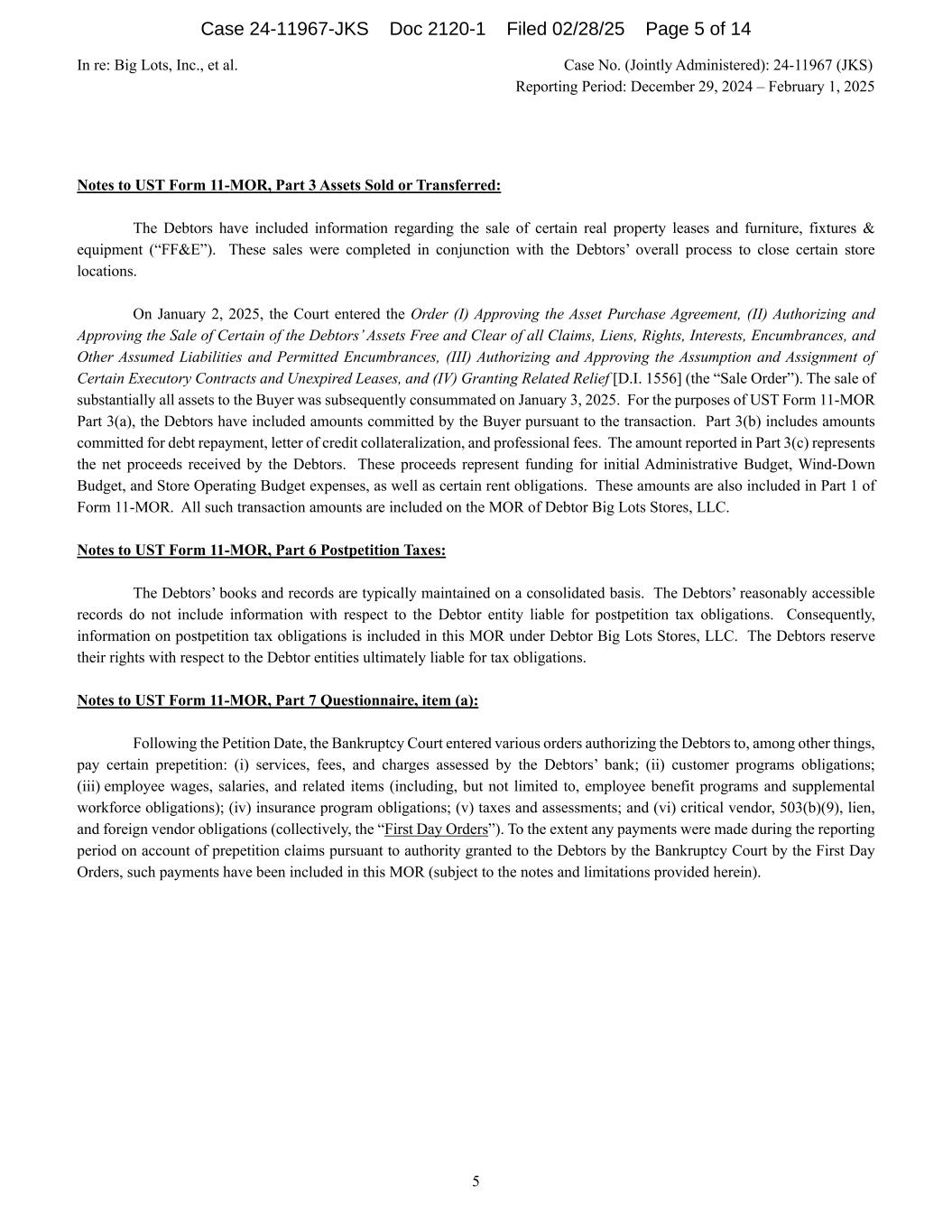 In re: Big Lots, Inc., et al. Case No. (Jointly Administered): 24-11967 (JKS) Reporting Period: December 29, 2024 – February 1, 2025 5 Notes to UST Form 11-MOR, Part 3 Assets Sold or Transferred: The Debtors have included information regarding the sale of certain real property leases and furniture, fixtures & equipment (“FF&E”). These sales were completed in conjunction with the Debtors’ overall process to close certain store locations. On January 2, 2025, the Court entered the Order (I) Approving the Asset Purchase Agreement, (II) Authorizing and Approving the Sale of Certain of the Debtors’ Assets Free and Clear of all Claims, Liens, Rights, Interests, Encumbrances, and Other Assumed Liabilities and Permitted Encumbrances, (III) Authorizing and Approving the Assumption and Assignment of Certain Executory Contracts and Unexpired Leases, and (IV) Granting Related Relief [D.I. 1556] (the “Sale Order”). The sale of substantially all assets to the Buyer was subsequently consummated on January 3, 2025. For the purposes of UST Form 11-MOR Part 3(a), the Debtors have included amounts committed by the Buyer pursuant to the transaction. Part 3(b) includes amounts committed for debt repayment, letter of credit collateralization, and professional fees. The amount reported in Part 3(c) represents the net proceeds received by the Debtors. These proceeds represent funding for initial Administrative Budget, Wind-Down Budget, and Store Operating Budget expenses, as well as certain rent obligations. These amounts are also included in Part 1 of Form 11-MOR. All such transaction amounts are included on the MOR of Debtor Big Lots Stores, LLC. Notes to UST Form 11-MOR, Part 6 Postpetition Taxes: The Debtors’ books and records are typically maintained on a consolidated basis. The Debtors’ reasonably accessible records do not include information with respect to the Debtor entity liable for postpetition tax obligations. Consequently, information on postpetition tax obligations is included in this MOR under Debtor Big Lots Stores, LLC. The Debtors reserve their rights with respect to the Debtor entities ultimately liable for tax obligations. Notes to UST Form 11-MOR, Part 7 Questionnaire, item (a): Following the Petition Date, the Bankruptcy Court entered various orders authorizing the Debtors to, among other things, pay certain prepetition: (i) services, fees, and charges assessed by the Debtors’ bank; (ii) customer programs obligations; (iii) employee wages, salaries, and related items (including, but not limited to, employee benefit programs and supplemental workforce obligations); (iv) insurance program obligations; (v) taxes and assessments; and (vi) critical vendor, 503(b)(9), lien, and foreign vendor obligations (collectively, the “First Day Orders”). To the extent any payments were made during the reporting period on account of prepetition claims pursuant to authority granted to the Debtors by the Bankruptcy Court by the First Day Orders, such payments have been included in this MOR (subject to the notes and limitations provided herein). Case 24-11967-JKS Doc 2120-1 Filed 02/28/25 Page 5 of 14