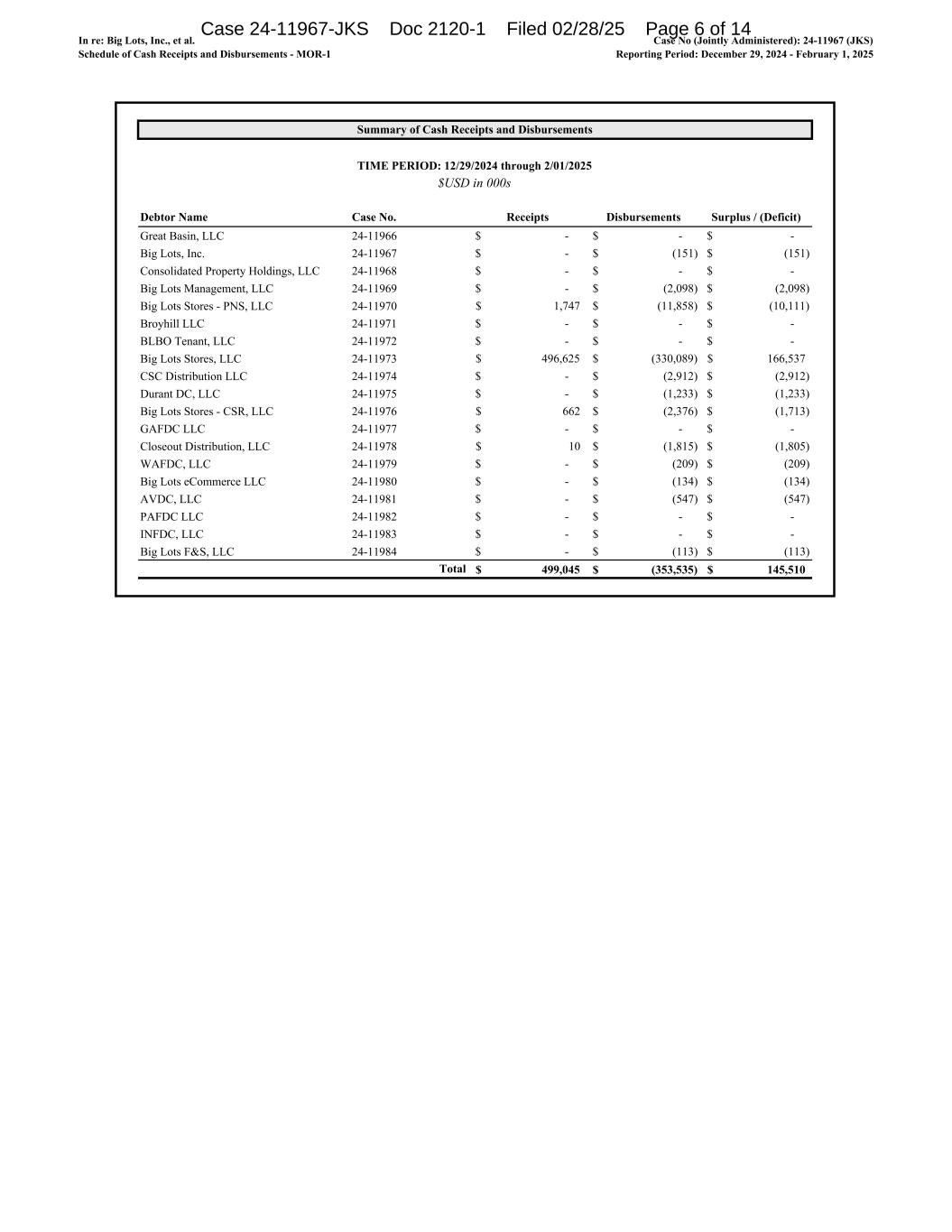 In re: Big Lots, Inc., et al. Schedule of Cash Receipts and Disbursements - MOR-1 Case No (Jointly Administered): 24-11967 (JKS) Reporting Period: December 29, 2024 - February 1, 2025 Summary of Cash Receipts and Disbursements TIME PERIOD: 12/29/2024 through 2/01/2025 Debtor Name Case No. Receipts Disbursements Surplus / (Deficit) Great Basin, LLC 24-11966 -$ -$ -$ Big Lots, Inc. 24-11967 -$ (151)$ (151)$ Consolidated Property Holdings, LLC 24-11968 -$ -$ -$ Big Lots Management, LLC 24-11969 -$ (2,098)$ (2,098)$ Big Lots Stores - PNS, LLC 24-11970 1,747$ (11,858)$ (10,111)$ Broyhill LLC 24-11971 -$ -$ -$ BLBO Tenant, LLC 24-11972 -$ -$ -$ Big Lots Stores, LLC 24-11973 496,625$ (330,089)$ 166,537$ CSC Distribution LLC 24-11974 -$ (2,912)$ (2,912)$ Durant DC, LLC 24-11975 -$ (1,233)$ (1,233)$ Big Lots Stores - CSR, LLC 24-11976 662$ (2,376)$ (1,713)$ GAFDC LLC 24-11977 -$ -$ -$ Closeout Distribution, LLC 24-11978 10$ (1,815)$ (1,805)$ WAFDC, LLC 24-11979 -$ (209)$ (209)$ Big Lots eCommerce LLC 24-11980 -$ (134)$ (134)$ AVDC, LLC 24-11981 -$ (547)$ (547)$ PAFDC LLC 24-11982 -$ -$ -$ INFDC, LLC 24-11983 -$ -$ -$ Big Lots F&S, LLC 24-11984 -$ (113)$ (113)$ Total 499,045$ (353,535)$ 145,510$ $USD in 000s Case 24-11967-JKS Doc 2120-1 Filed 02/28/25 Page 6 of 14