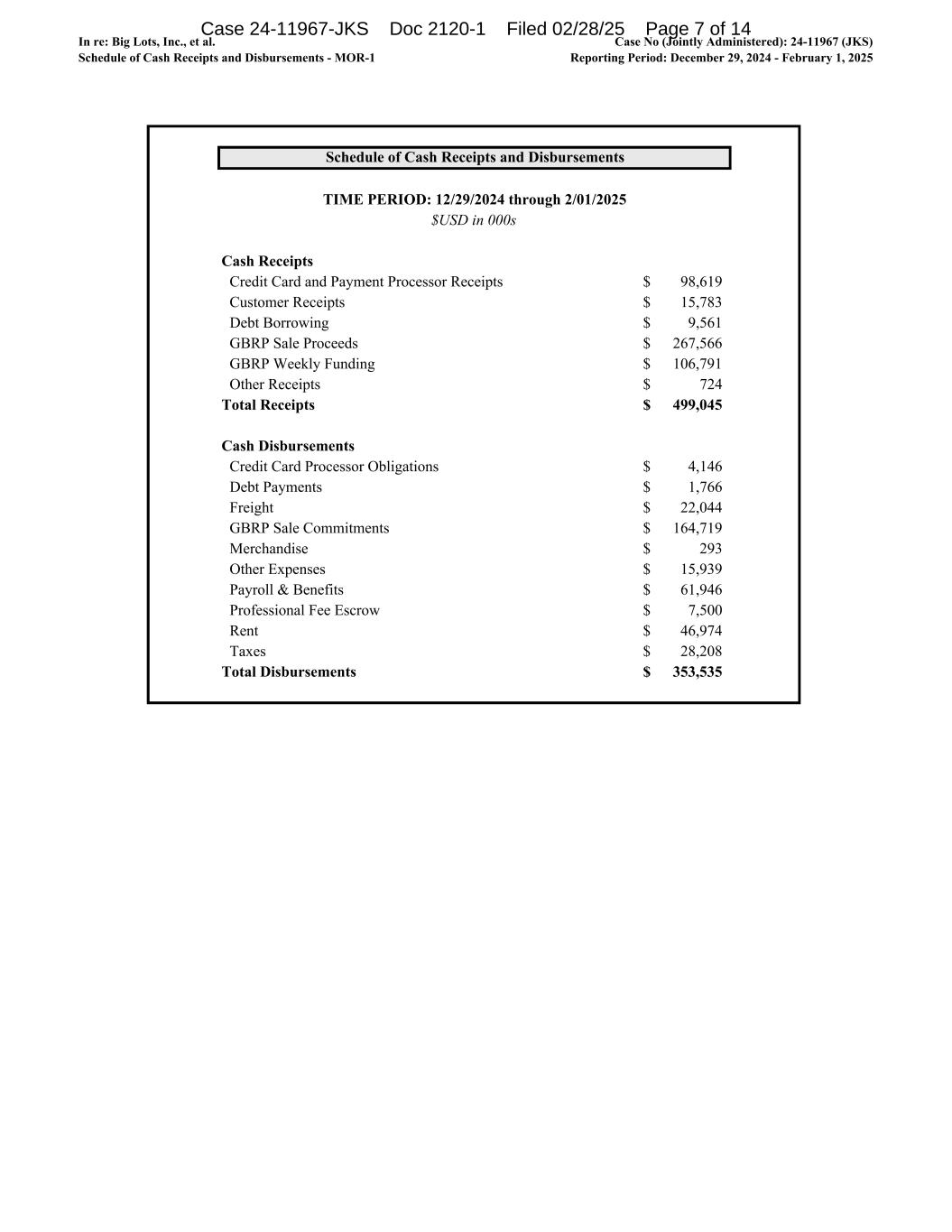 In re: Big Lots, Inc., et al. Schedule of Cash Receipts and Disbursements - MOR-1 Case No (Jointly Administered): 24-11967 (JKS) Reporting Period: December 29, 2024 - February 1, 2025 Schedule of Cash Receipts and Disbursements TIME PERIOD: 12/29/2024 through 2/01/2025 Cash Receipts Credit Card and Payment Processor Receipts 98,619$ Customer Receipts 15,783$ Debt Borrowing 9,561$ GBRP Sale Proceeds 267,566$ GBRP Weekly Funding 106,791$ Other Receipts 724$ Total Receipts 499,045$ Cash Disbursements Credit Card Processor Obligations 4,146$ Debt Payments 1,766$ Freight 22,044$ GBRP Sale Commitments 164,719$ Merchandise 293$ Other Expenses 15,939$ Payroll & Benefits 61,946$ Professional Fee Escrow 7,500$ Rent 46,974$ Taxes 28,208$ Total Disbursements 353,535$ $USD in 000s Case 24-11967-JKS Doc 2120-1 Filed 02/28/25 Page 7 of 14