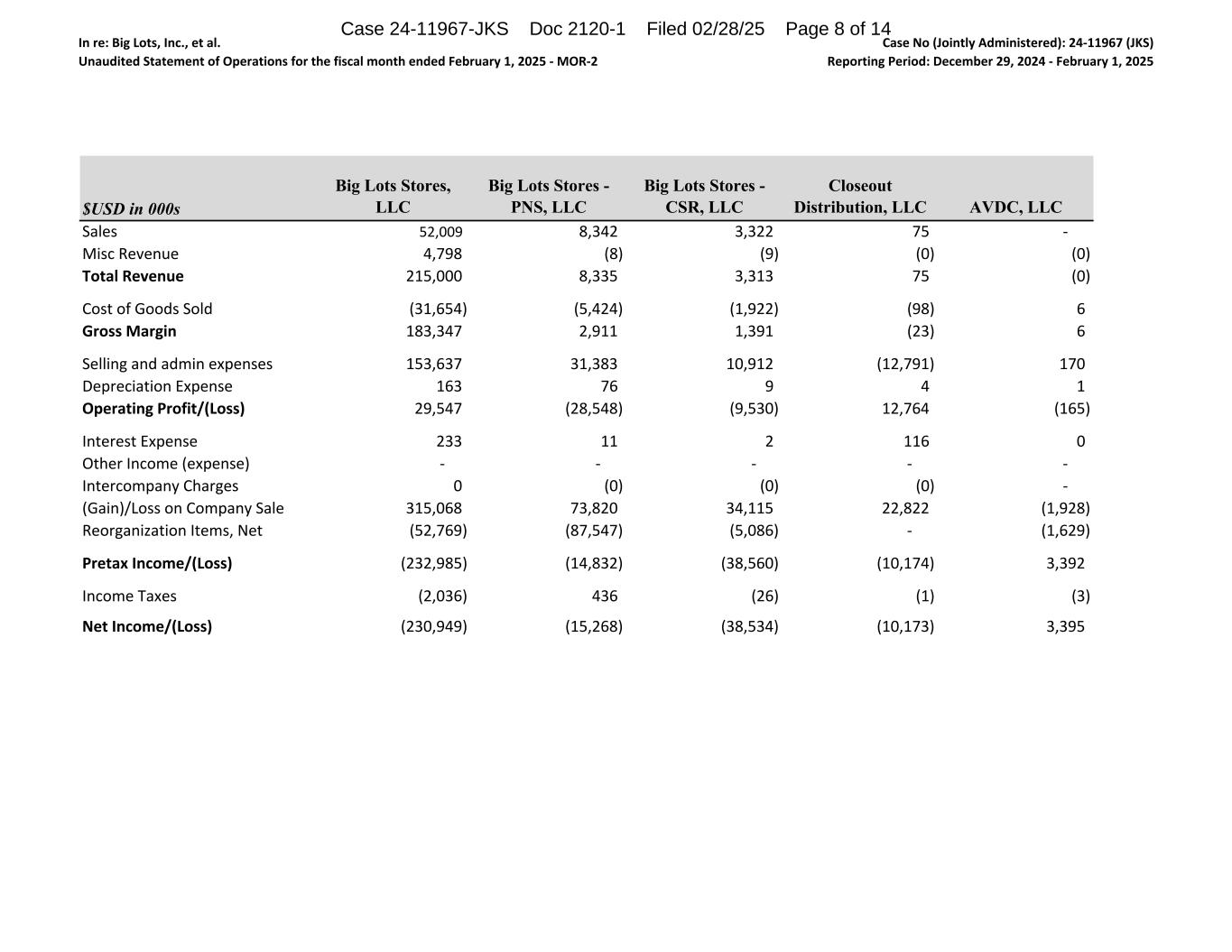 In re: Big Lots, Inc., et al. Unaudited Statement of Operations for the fiscal month ended February 1, 2025 - MOR-2 Case No (Jointly Administered): 24-11967 (JKS) Reporting Period: December 29, 2024 - February 1, 2025 $USD in 000s Big Lots Stores, LLC Big Lots Stores - PNS, LLC Big Lots Stores - CSR, LLC Closeout Distribution, LLC AVDC, LLC Sales 52,009 8,342 3,322 75 - Misc Revenue 4,798 (8) (9) (0) (0) Total Revenue 215,000 8,335 3,313 75 (0) Cost of Goods Sold (31,654) (5,424) (1,922) (98) 6 Gross Margin 183,347 2,911 1,391 (23) 6 Selling and admin expenses 153,637 31,383 10,912 (12,791) 170 Depreciation Expense 163 76 9 4 1 Operating Profit/(Loss) 29,547 (28,548) (9,530) 12,764 (165) Interest Expense 233 11 2 116 0 Other Income (expense) - - - - - Intercompany Charges 0 (0) (0) (0) - (Gain)/Loss on Company Sale 315,068 73,820 34,115 22,822 (1,928) Reorganization Items, Net (52,769) (87,547) (5,086) - (1,629) Pretax Income/(Loss) (232,985) (14,832) (38,560) (10,174) 3,392 Income Taxes (2,036) 436 (26) (1) (3) Net Income/(Loss) (230,949) (15,268) (38,534) (10,173) 3,395 Case 24-11967-JKS Doc 2120-1 Filed 02/28/25 Page 8 of 14