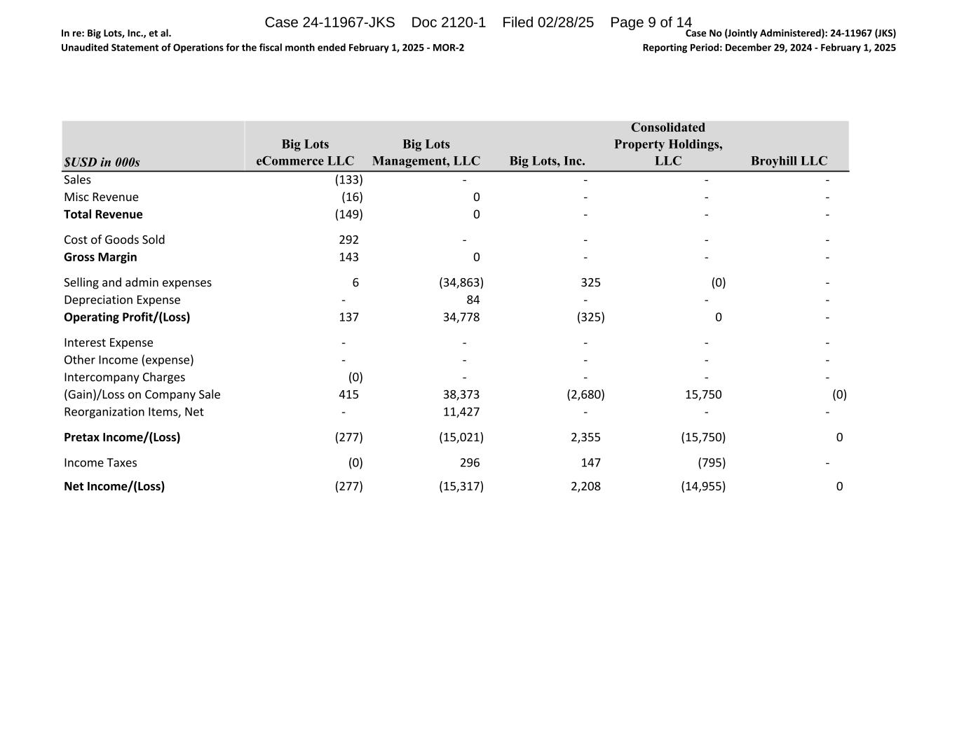 In re: Big Lots, Inc., et al. Unaudited Statement of Operations for the fiscal month ended February 1, 2025 - MOR-2 Case No (Jointly Administered): 24-11967 (JKS) Reporting Period: December 29, 2024 - February 1, 2025 $USD in 000s Sales Misc Revenue Total Revenue Cost of Goods Sold Gross Margin Selling and admin expenses Depreciation Expense Operating Profit/(Loss) Interest Expense Other Income (expense) Intercompany Charges (Gain)/Loss on Company Sale Reorganization Items, Net Pretax Income/(Loss) Income Taxes Net Income/(Loss) Big Lots eCommerce LLC Big Lots Management, LLC Big Lots, Inc. Consolidated Property Holdings, LLC Broyhill LLC (133) - - - - (16) 0 - - - (149) 0 - - - 292 - - - - 143 0 - - - 6 (34,863) 325 (0) - - 84 - - - 137 34,778 (325) 0 - - - - - - - - - - - (0) - - - - 415 38,373 (2,680) 15,750 (0) - 11,427 - - - (277) (15,021) 2,355 (15,750) 0 (0) 296 147 (795) - (277) (15,317) 2,208 (14,955) 0 Case 24-11967-JKS Doc 2120-1 Filed 02/28/25 Page 9 of 14