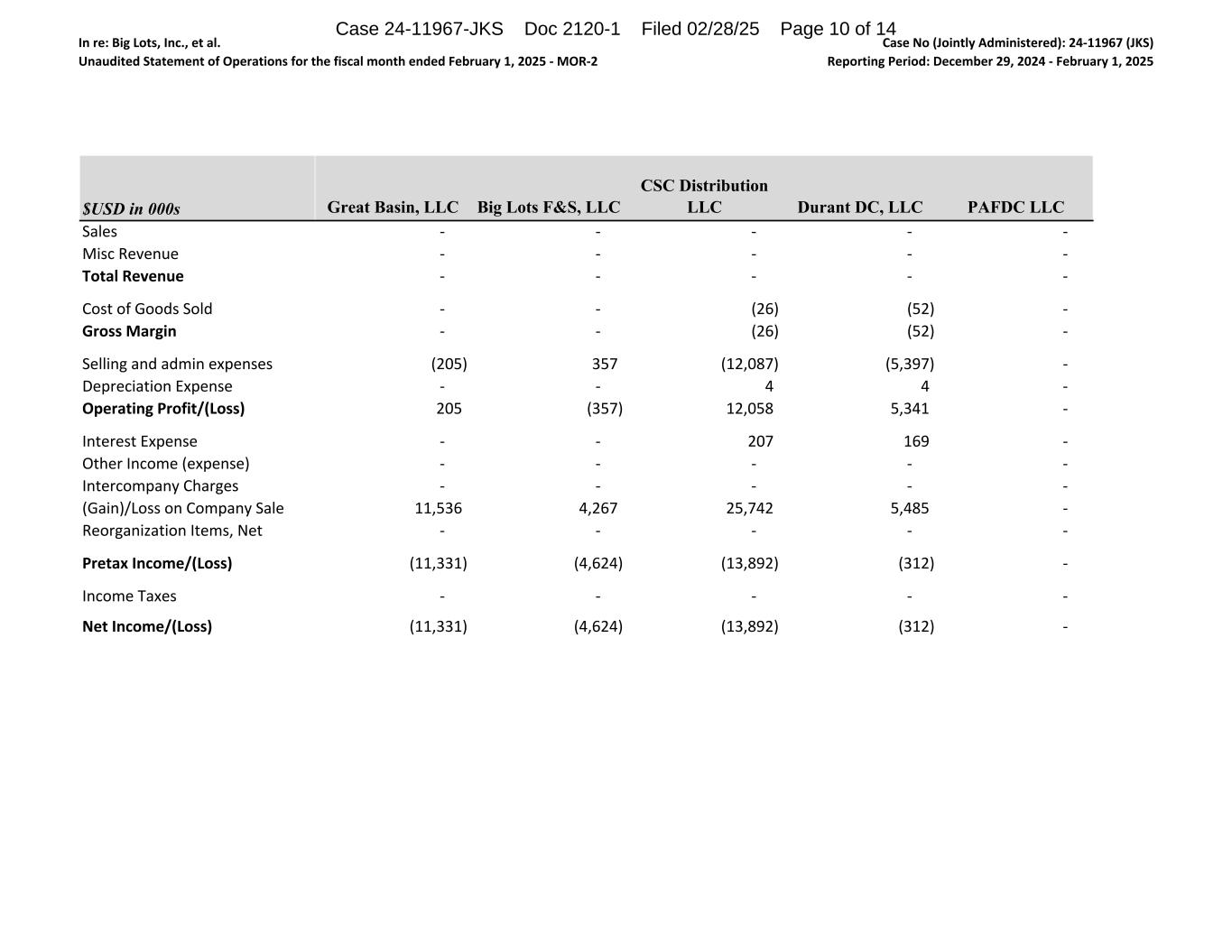 In re: Big Lots, Inc., et al. Unaudited Statement of Operations for the fiscal month ended February 1, 2025 - MOR-2 Case No (Jointly Administered): 24-11967 (JKS) Reporting Period: December 29, 2024 - February 1, 2025 $USD in 000s Sales Misc Revenue Total Revenue Cost of Goods Sold Gross Margin Selling and admin expenses Depreciation Expense Operating Profit/(Loss) Interest Expense Other Income (expense) Intercompany Charges (Gain)/Loss on Company Sale Reorganization Items, Net Pretax Income/(Loss) Income Taxes Net Income/(Loss) Great Basin, LLC Big Lots F&S, LLC CSC Distribution LLC Durant DC, LLC PAFDC LLC - - - - - - - - - - - - - - - - - (26) (52) - - - (26) (52) - (205) 357 (12,087) (5,397) - - - 4 4 - 205 (357) 12,058 5,341 - - - 207 169 - - - - - - - - - - - 11,536 4,267 25,742 5,485 - - - - - - (11,331) (4,624) (13,892) (312) - - - - - - (11,331) (4,624) (13,892) (312) - Case 24-11967-JKS Doc 2120-1 Filed 02/28/25 Page 10 of 14