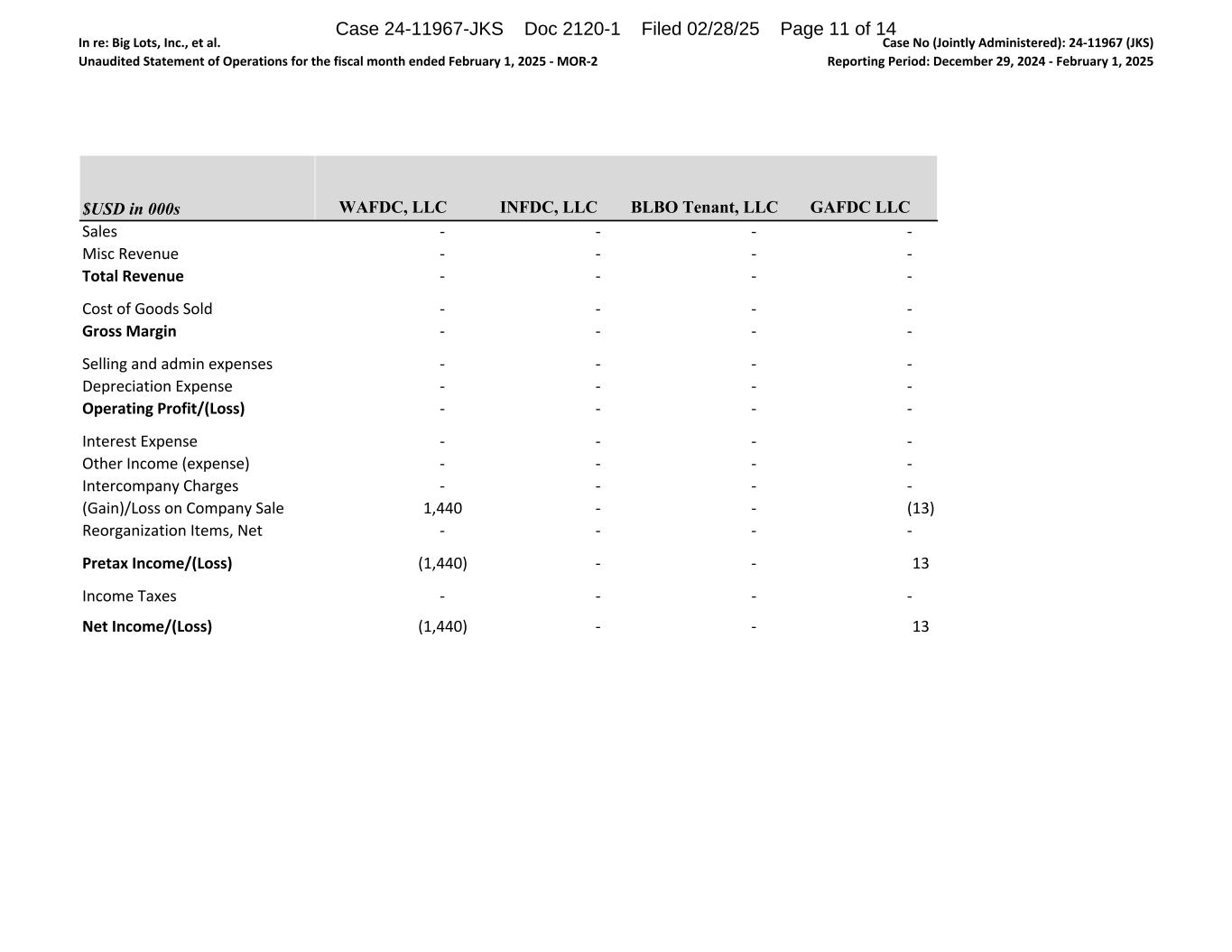 In re: Big Lots, Inc., et al. Unaudited Statement of Operations for the fiscal month ended February 1, 2025 - MOR-2 Case No (Jointly Administered): 24-11967 (JKS) Reporting Period: December 29, 2024 - February 1, 2025 $USD in 000s Sales Misc Revenue Total Revenue Cost of Goods Sold Gross Margin Selling and admin expenses Depreciation Expense Operating Profit/(Loss) Interest Expense Other Income (expense) Intercompany Charges (Gain)/Loss on Company Sale Reorganization Items, Net Pretax Income/(Loss) Income Taxes Net Income/(Loss) WAFDC, LLC INFDC, LLC BLBO Tenant, LLC GAFDC LLC - - - - - - - - - - - - - - - - - - - - - - - - - - - - - - - - - - - - - - - - - - - - 1,440 - - (13) - - - - (1,440) - - 13 - - - - (1,440) - - 13 Case 24-11967-JKS Doc 2120-1 Filed 02/28/25 Page 11 of 14