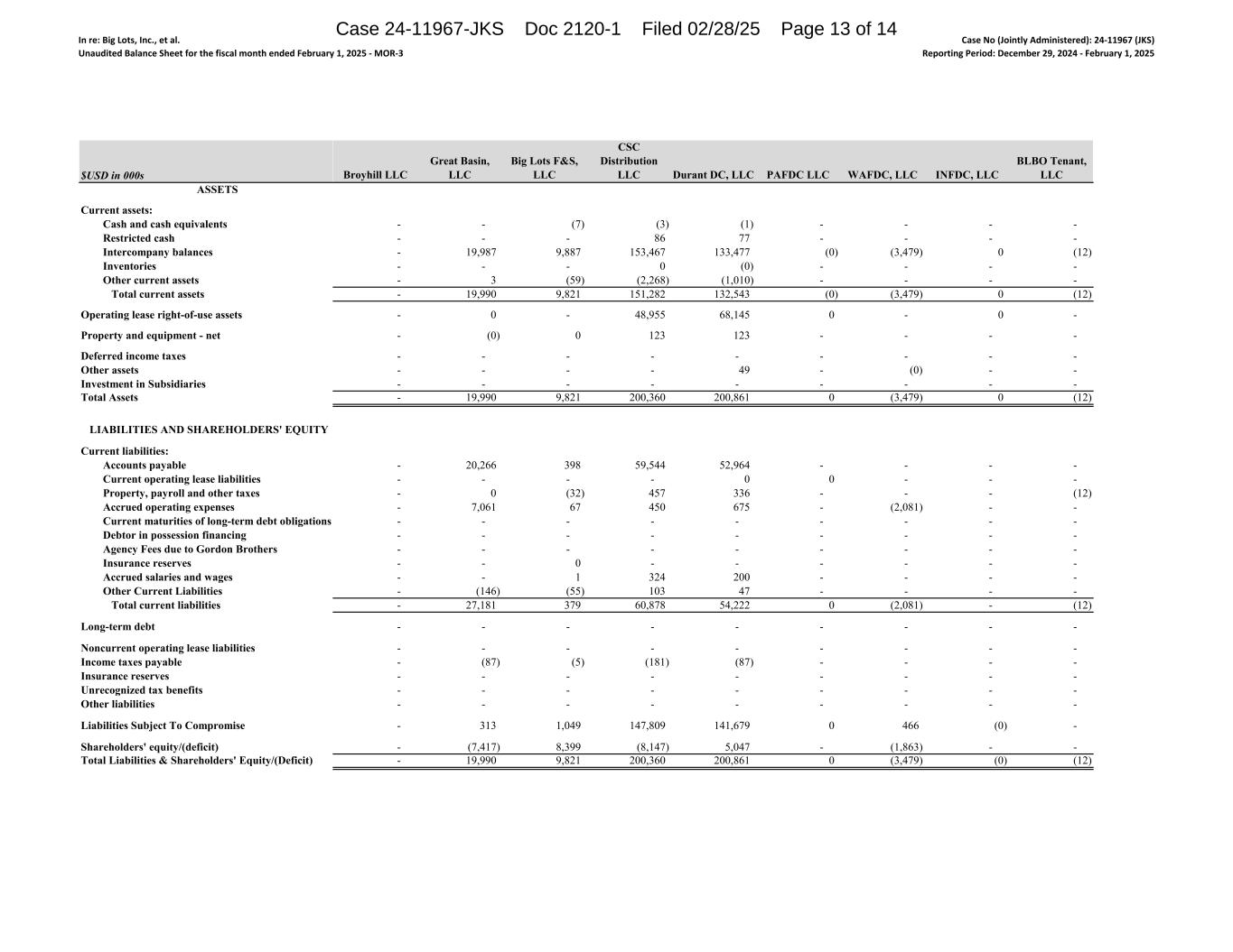 In re: Big Lots, Inc., et al. Unaudited Balance Sheet for the fiscal month ended February 1, 2025 - MOR-3 Case No (Jointly Administered): 24-11967 (JKS) Reporting Period: December 29, 2024 - February 1, 2025 $USD in 000s Big Lots Stores, LLC Big Lots Stores - PNS, LLC Big Lots Stores - CSR, LLC Closeout Distribution, LLC AVDC, LLC Big Lots eCommerce LLC Big Lots Management, LLC Big Lots, Inc. Consolidated Property Holdings, LLC ASSETS Current assets: Cash and cash equivalents 74,797 1,061 819 (3,077) 30 3,423 57,285 48 52 Restricted cash 99,376 1,760 - (1) - - - 308 - Intercompany balances (335,581) 683,886 79,092 166,925 122,649 14,491 (1,232,855) 154,208 32,381 Inventories (0) (0) (0) 0 0 0 - - - Other current assets 54,450 2,118 294 (1,815) (10,621) (979) 2,386 (5,492) 9,536 Total current assets (106,959) 688,825 80,205 162,032 112,058 16,935 (1,173,184) 149,071 41,969 Operating lease right-of-use assets 460,746 70,222 31,978 77,615 (0) - - (0) - Property and equipment - net 2,163 1,820 161 125 15 45 55,398 - - Deferred income taxes - - - - - - - - - Other assets 13,356 351 80 8 484 - 19 - 0 Investment in Subsidiaries 124,702 - - - - - 76,262 (727,483) - Total Assets 494,008 761,218 112,423 239,780 112,557 16,980 (1,041,504) (578,412) 41,969 LIABILITIES AND SHAREHOLDERS' EQUITY Current liabilities: Accounts payable (43,547) 11,804 1,360 82,643 507 2,090 (10) 10 - Current operating lease liabilities 0 (0) 0 0 - - - - - Property, payroll and other taxes 32,948 9,807 4,969 300 (55) (60) 1,378 (102) (39) Accrued operating expenses 70,811 18,969 3,452 1,338 448 7,249 29,208 85 3 Current maturities of long-term debt obligations - - - - - - - - - Debtor in possession financing - - - - - - - - - Agency Fees due to Gordon Brothers - (35,556) 39,219 15,573 317 1 141 (2,926) - Insurance reserves 0 - - - - - - - - Accrued salaries and wages 5,104 1,258 338 354 178 - 3,784 - - Other Current Liabilities (36,535) (2,264) (173) (103) 1,180 (58) 45,328 188 (1,384) Total current liabilities (6,774) 78,794 25,519 84,848 2,258 9,362 76,763 181 (1,419) Long-term debt (171) - - - - - 171 - - Noncurrent operating lease liabilities 0 - - - 0 - - - - Income taxes payable 4,262 (3,122) (74) (175) (356) 9 43 (258) 31 Insurance reserves - - - - - - - - - Unrecognized tax benefits 4,139 (57) - - - - - (2) - Other liabilities - - - - - - - - - Liabilities Subject To Compromise 831,302 200,541 43,152 159,830 96,179 2,092 10,803 265 (11) Shareholders' equity/(deficit) (338,750) 485,063 43,826 (4,724) 14,476 5,517 (1,129,285) (578,598) 43,369 Total Liabilities & Shareholders' Equity/(Deficit) 494,008 761,218 112,423 239,780 112,557 16,980 (1,041,504) (578,412) 41,969 Case 24-11967-JKS Doc 2120-1 Filed 02/28/25 Page 12 of 14