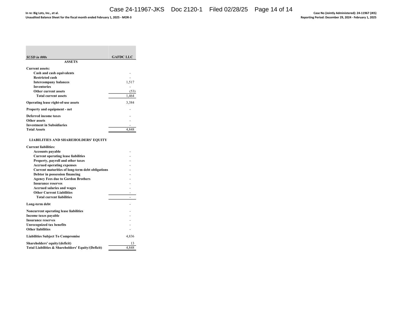 In re: Big Lots, Inc., et al. Unaudited Balance Sheet for the fiscal month ended February 1, 2025 - MOR-3 Case No (Jointly Administered): 24-11967 (JKS) Reporting Period: December 29, 2024 - February 1, 2025 $USD in 000s ASSETS Current assets: Cash and cash equivalents Restricted cash Intercompany balances Inventories Other current assets Total current assets Operating lease right-of-use assets Property and equipment - net Deferred income taxes Other assets Investment in Subsidiaries Total Assets LIABILITIES AND SHAREHOLDERS' EQUITY Current liabilities: Accounts payable Current operating lease liabilities Property, payroll and other taxes Accrued operating expenses Current maturities of long-term debt obligations Debtor in possession financing Agency Fees due to Gordon Brothers Insurance reserves Accrued salaries and wages Other Current Liabilities Total current liabilities Long-term debt Noncurrent operating lease liabilities Income taxes payable Insurance reserves Unrecognized tax benefits Other liabilities Liabilities Subject To Compromise Shareholders' equity/(deficit) Total Liabilities & Shareholders' Equity/(Deficit) GAFDC LLC - - 1,517 - (53) 1,464 3,384 - - - - 4,848 - - - - - - - - - - - - - - - - - 4,836 13 4,848 Case 24-11967-JKS Doc 2120-1 Filed 02/28/25 Page 14 of 14