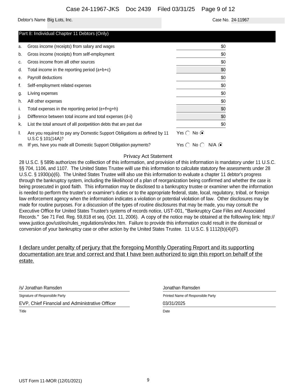 UST Form 11-MOR (12/01/2021) 9 Debtor's Name Big Lots, Inc. Case No. 24-11967 Part 8: Individual Chapter 11 Debtors (Only) a. Gross income (receipts) from salary and wages $0 b. Gross income (receipts) from self-employment $0 c. Gross income from all other sources $0 d. Total income in the reporting period (a+b+c) $0 e. Payroll deductions $0 f. Self-employment related expenses $0 g. Living expenses $0 h. All other expenses $0 i. Total expenses in the reporting period (e+f+g+h) $0 j. Difference between total income and total expenses (d-i) $0 k. List the total amount of all postpetition debts that are past due $0 l. Are you required to pay any Domestic Support Obligations as defined by 11 U.S.C § 101(14A)? Yes No m. Yes No N/AIf yes, have you made all Domestic Support Obligation payments? Privacy Act Statement 28 U.S.C. § 589b authorizes the collection of this information, and provision of this information is mandatory under 11 U.S.C. §§ 704, 1106, and 1107. The United States Trustee will use this information to calculate statutory fee assessments under 28 U.S.C. § 1930(a)(6). The United States Trustee will also use this information to evaluate a chapter 11 debtor's progress through the bankruptcy system, including the likelihood of a plan of reorganization being confirmed and whether the case is being prosecuted in good faith. This information may be disclosed to a bankruptcy trustee or examiner when the information is needed to perform the trustee's or examiner's duties or to the appropriate federal, state, local, regulatory, tribal, or foreign law enforcement agency when the information indicates a violation or potential violation of law. Other disclosures may be made for routine purposes. For a discussion of the types of routine disclosures that may be made, you may consult the Executive Office for United States Trustee's systems of records notice, UST-001, "Bankruptcy Case Files and Associated Records." See 71 Fed. Reg. 59,818 et seq. (Oct. 11, 2006). A copy of the notice may be obtained at the following link: http:// www.justice.gov/ust/eo/rules_regulations/index.htm. Failure to provide this information could result in the dismissal or conversion of your bankruptcy case or other action by the United States Trustee. 11 U.S.C. § 1112(b)(4)(F). I declare under penalty of perjury that the foregoing Monthly Operating Report and its supporting documentation are true and correct and that I have been authorized to sign this report on behalf of the estate. /s/ Jonathan Ramsden Signature of Responsible Party EVP, Chief Financial and Administrative Officer Printed Name of Responsible Party 03/31/2025 DateTitle Jonathan Ramsden Case 24-11967-JKS Doc 2439 Filed 03/31/25 Page 9 of 12