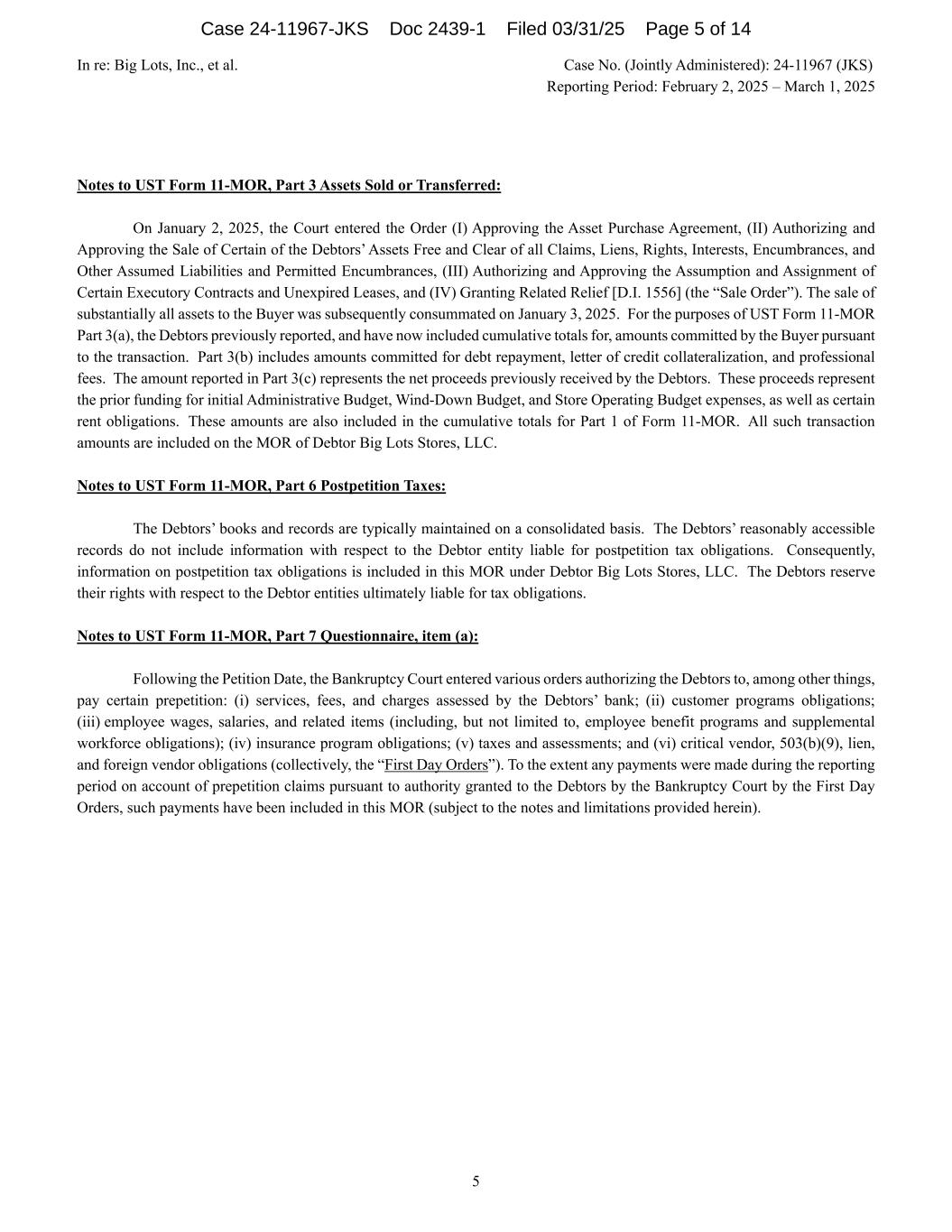 In re: Big Lots, Inc., et al. Case No. (Jointly Administered): 24-11967 (JKS) Reporting Period: February 2, 2025 – March 1, 2025 5 Notes to UST Form 11-MOR, Part 3 Assets Sold or Transferred: On January 2, 2025, the Court entered the Order (I) Approving the Asset Purchase Agreement, (II) Authorizing and Approving the Sale of Certain of the Debtors’ Assets Free and Clear of all Claims, Liens, Rights, Interests, Encumbrances, and Other Assumed Liabilities and Permitted Encumbrances, (III) Authorizing and Approving the Assumption and Assignment of Certain Executory Contracts and Unexpired Leases, and (IV) Granting Related Relief [D.I. 1556] (the “Sale Order”). The sale of substantially all assets to the Buyer was subsequently consummated on January 3, 2025. For the purposes of UST Form 11-MOR Part 3(a), the Debtors previously reported, and have now included cumulative totals for, amounts committed by the Buyer pursuant to the transaction. Part 3(b) includes amounts committed for debt repayment, letter of credit collateralization, and professional fees. The amount reported in Part 3(c) represents the net proceeds previously received by the Debtors. These proceeds represent the prior funding for initial Administrative Budget, Wind-Down Budget, and Store Operating Budget expenses, as well as certain rent obligations. These amounts are also included in the cumulative totals for Part 1 of Form 11-MOR. All such transaction amounts are included on the MOR of Debtor Big Lots Stores, LLC. Notes to UST Form 11-MOR, Part 6 Postpetition Taxes: The Debtors’ books and records are typically maintained on a consolidated basis. The Debtors’ reasonably accessible records do not include information with respect to the Debtor entity liable for postpetition tax obligations. Consequently, information on postpetition tax obligations is included in this MOR under Debtor Big Lots Stores, LLC. The Debtors reserve their rights with respect to the Debtor entities ultimately liable for tax obligations. Notes to UST Form 11-MOR, Part 7 Questionnaire, item (a): Following the Petition Date, the Bankruptcy Court entered various orders authorizing the Debtors to, among other things, pay certain prepetition: (i) services, fees, and charges assessed by the Debtors’ bank; (ii) customer programs obligations; (iii) employee wages, salaries, and related items (including, but not limited to, employee benefit programs and supplemental workforce obligations); (iv) insurance program obligations; (v) taxes and assessments; and (vi) critical vendor, 503(b)(9), lien, and foreign vendor obligations (collectively, the “First Day Orders”). To the extent any payments were made during the reporting period on account of prepetition claims pursuant to authority granted to the Debtors by the Bankruptcy Court by the First Day Orders, such payments have been included in this MOR (subject to the notes and limitations provided herein). Case 24-11967-JKS Doc 2439-1 Filed 03/31/25 Page 5 of 14
