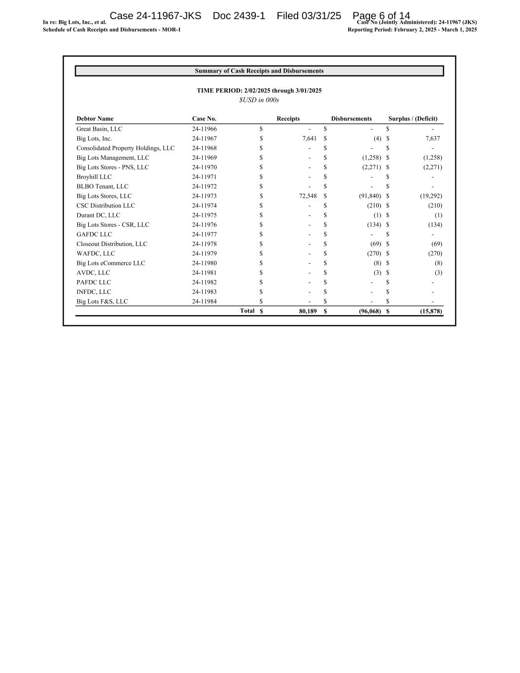 In re: Big Lots, Inc., et al. Schedule of Cash Receipts and Disbursements - MOR-1 Case No (Jointly Administered): 24-11967 (JKS) Reporting Period: February 2, 2025 - March 1, 2025 Summary of Cash Receipts and Disbursements TIME PERIOD: 2/02/2025 through 3/01/2025 Debtor Name Case No. Receipts Disbursements Surplus / (Deficit) Great Basin, LLC 24-11966 -$ -$ -$ Big Lots, Inc. 24-11967 7,641$ (4)$ 7,637$ Consolidated Property Holdings, LLC 24-11968 -$ -$ -$ Big Lots Management, LLC 24-11969 -$ (1,258)$ (1,258)$ Big Lots Stores - PNS, LLC 24-11970 -$ (2,271)$ (2,271)$ Broyhill LLC 24-11971 -$ -$ -$ BLBO Tenant, LLC 24-11972 -$ -$ -$ Big Lots Stores, LLC 24-11973 72,548$ (91,840)$ (19,292)$ CSC Distribution LLC 24-11974 -$ (210)$ (210)$ Durant DC, LLC 24-11975 -$ (1)$ (1)$ Big Lots Stores - CSR, LLC 24-11976 -$ (134)$ (134)$ GAFDC LLC 24-11977 -$ -$ -$ Closeout Distribution, LLC 24-11978 -$ (69)$ (69)$ WAFDC, LLC 24-11979 -$ (270)$ (270)$ Big Lots eCommerce LLC 24-11980 -$ (8)$ (8)$ AVDC, LLC 24-11981 -$ (3)$ (3)$ PAFDC LLC 24-11982 -$ -$ -$ INFDC, LLC 24-11983 -$ -$ -$ Big Lots F&S, LLC 24-11984 -$ -$ -$ Total 80,189$ (96,068)$ (15,878)$ $USD in 000s Case 24-11967-JKS Doc 2439-1 Filed 03/31/25 Page 6 of 14
