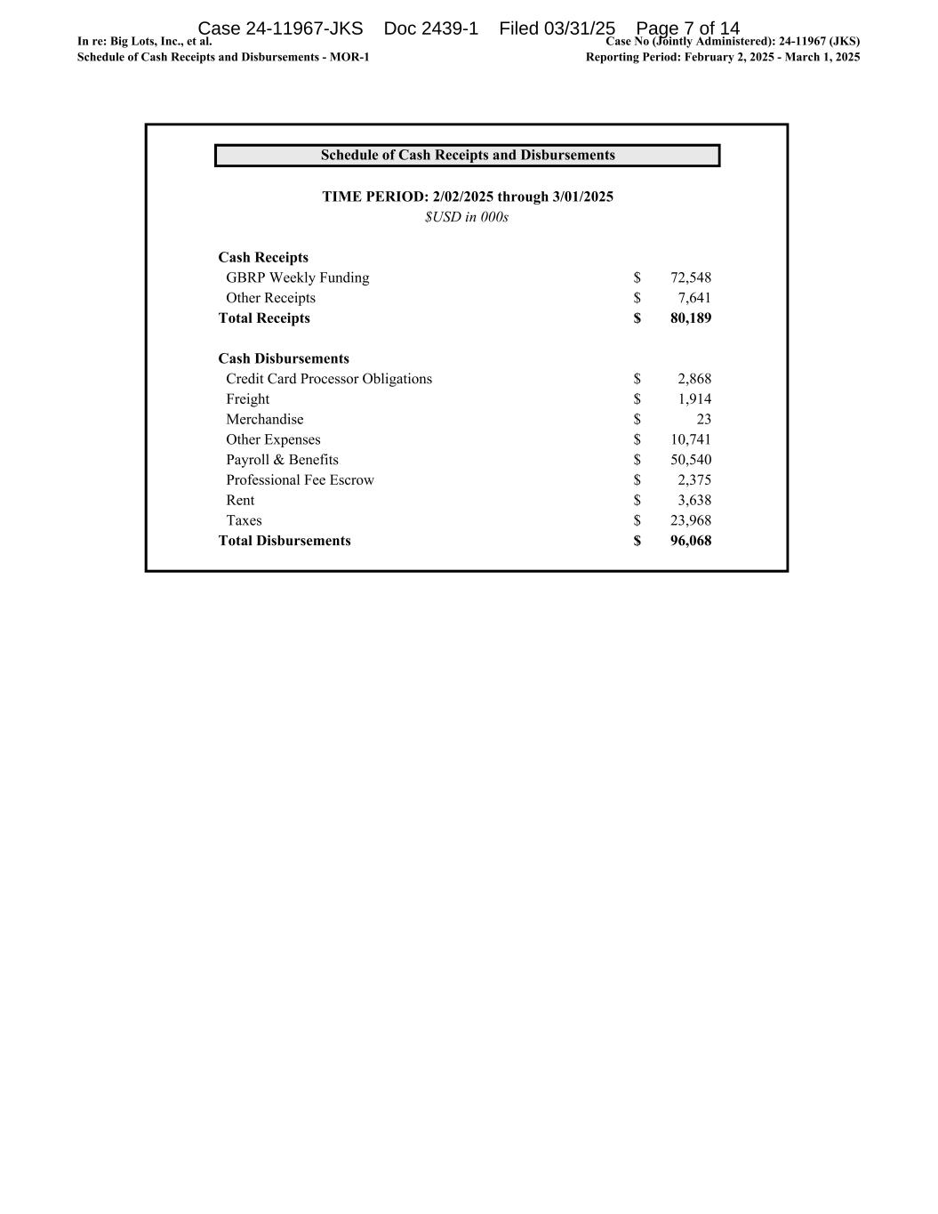 In re: Big Lots, Inc., et al. Schedule of Cash Receipts and Disbursements - MOR-1 Case No (Jointly Administered): 24-11967 (JKS) Reporting Period: February 2, 2025 - March 1, 2025 Schedule of Cash Receipts and Disbursements TIME PERIOD: 2/02/2025 through 3/01/2025 Cash Receipts GBRP Weekly Funding 72,548$ Other Receipts 7,641$ Total Receipts 80,189$ Cash Disbursements Credit Card Processor Obligations 2,868$ Freight 1,914$ Merchandise 23$ Other Expenses 10,741$ Payroll & Benefits 50,540$ Professional Fee Escrow 2,375$ Rent 3,638$ Taxes 23,968$ Total Disbursements 96,068$ $USD in 000s Case 24-11967-JKS Doc 2439-1 Filed 03/31/25 Page 7 of 14