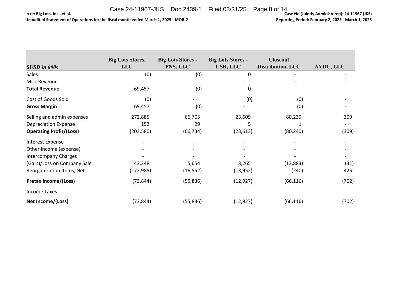 In re: Big Lots, Inc., et al. Unaudited Statement of Operations for the fiscal month ended March 1, 2025 - MOR-2 Case No (Jointly Administered): 24-11967 (JKS) Reporting Period: February 2, 2025 - March 1, 2025 $USD in 000s Big Lots Stores, LLC Big Lots Stores - PNS, LLC Big Lots Stores - CSR, LLC Closeout Distribution, LLC AVDC, LLC Sales (0) (0) 0 - - Misc Revenue - - - - - Total Revenue 69,457 (0) 0 - - Cost of Goods Sold (0) - (0) (0) - Gross Margin 69,457 (0) - (0) - Selling and admin expenses 272,885 66,705 23,609 80,239 309 Depreciation Expense 152 29 5 1 - Operating Profit/(Loss) (203,580) (66,734) (23,613) (80,240) (309) Interest Expense - - - - - Other Income (expense) - - - - - Intercompany Charges - - - - - (Gain)/Loss on Company Sale 43,248 5,654 3,265 (13,883) (31) Reorganization Items, Net (172,985) (16,552) (13,952) (240) 425 Pretax Income/(Loss) (73,844) (55,836) (12,927) (66,116) (702) Income Taxes - - - - - Net Income/(Loss) (73,844) (55,836) (12,927) (66,116) (702) Case 24-11967-JKS Doc 2439-1 Filed 03/31/25 Page 8 of 14
