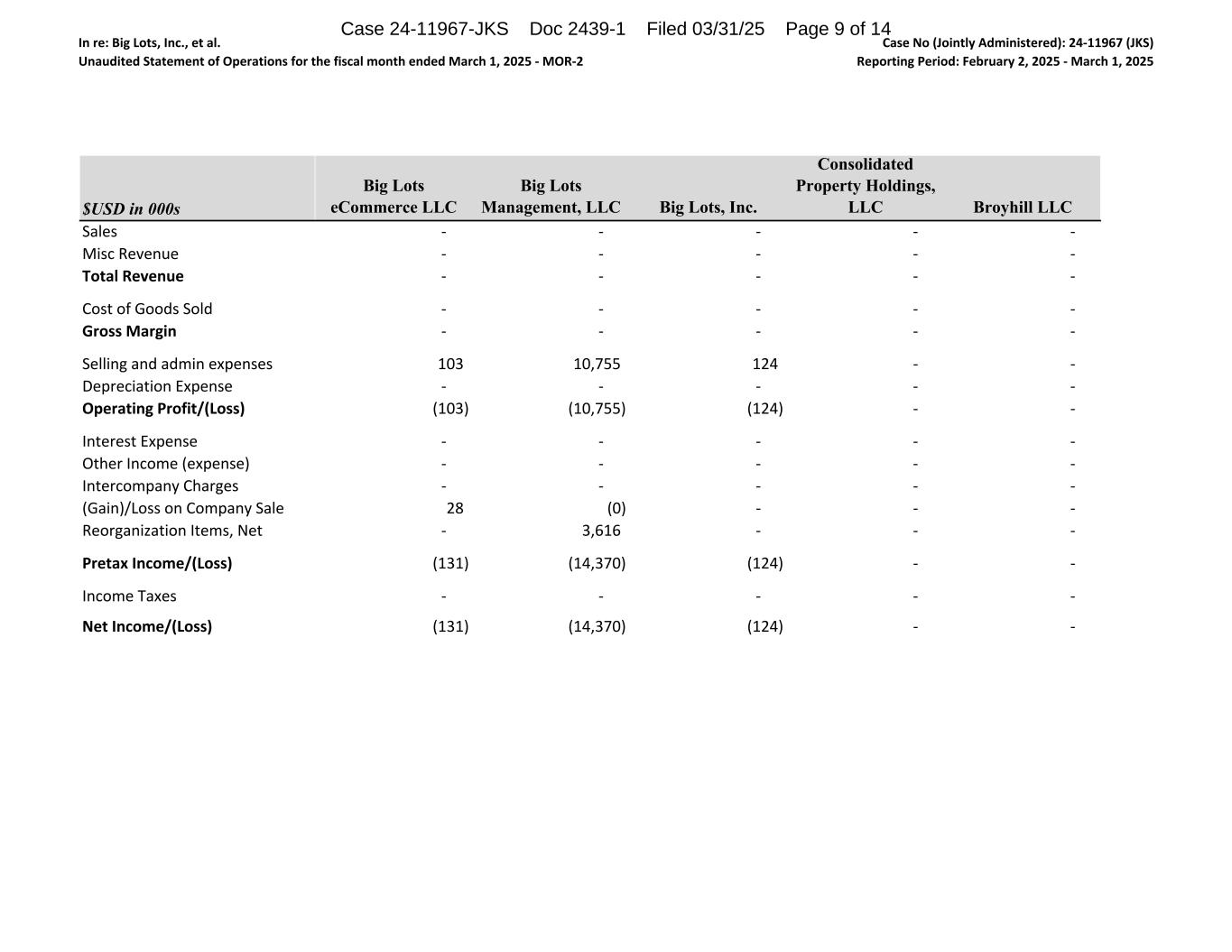 In re: Big Lots, Inc., et al. Unaudited Statement of Operations for the fiscal month ended March 1, 2025 - MOR-2 Case No (Jointly Administered): 24-11967 (JKS) Reporting Period: February 2, 2025 - March 1, 2025 $USD in 000s Sales Misc Revenue Total Revenue Cost of Goods Sold Gross Margin Selling and admin expenses Depreciation Expense Operating Profit/(Loss) Interest Expense Other Income (expense) Intercompany Charges (Gain)/Loss on Company Sale Reorganization Items, Net Pretax Income/(Loss) Income Taxes Net Income/(Loss) Big Lots eCommerce LLC Big Lots Management, LLC Big Lots, Inc. Consolidated Property Holdings, LLC Broyhill LLC - - - - - - - - - - - - - - - - - - - - - - - - - 103 10,755 124 - - - - - - - (103) (10,755) (124) - - - - - - - - - - - - - - - - - 28 (0) - - - - 3,616 - - - (131) (14,370) (124) - - - - - - - (131) (14,370) (124) - - Case 24-11967-JKS Doc 2439-1 Filed 03/31/25 Page 9 of 14