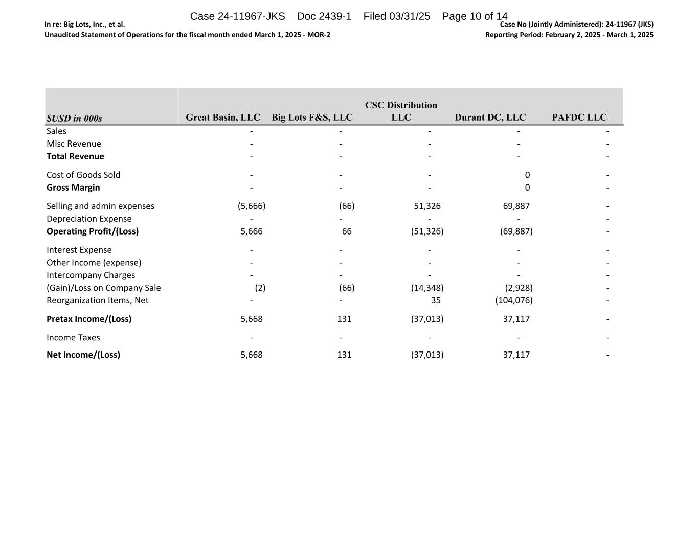 In re: Big Lots, Inc., et al. Unaudited Statement of Operations for the fiscal month ended March 1, 2025 - MOR-2 Case No (Jointly Administered): 24-11967 (JKS) Reporting Period: February 2, 2025 - March 1, 2025 $USD in 000s Sales Misc Revenue Total Revenue Cost of Goods Sold Gross Margin Selling and admin expenses Depreciation Expense Operating Profit/(Loss) Interest Expense Other Income (expense) Intercompany Charges (Gain)/Loss on Company Sale Reorganization Items, Net Pretax Income/(Loss) Income Taxes Net Income/(Loss) Great Basin, LLC Big Lots F&S, LLC CSC Distribution LLC Durant DC, LLC PAFDC LLC - - - - - - - - - - - - - - - - - - 0 - - - - 0 - (5,666) (66) 51,326 69,887 - - - - - - 5,666 66 (51,326) (69,887) - - - - - - - - - - - - - - - - (2) (66) (14,348) (2,928) - - - 35 (104,076) - 5,668 131 (37,013) 37,117 - - - - - - 5,668 131 (37,013) 37,117 - Case 24-11967-JKS Doc 2439-1 Filed 03/31/25 Page 10 of 14