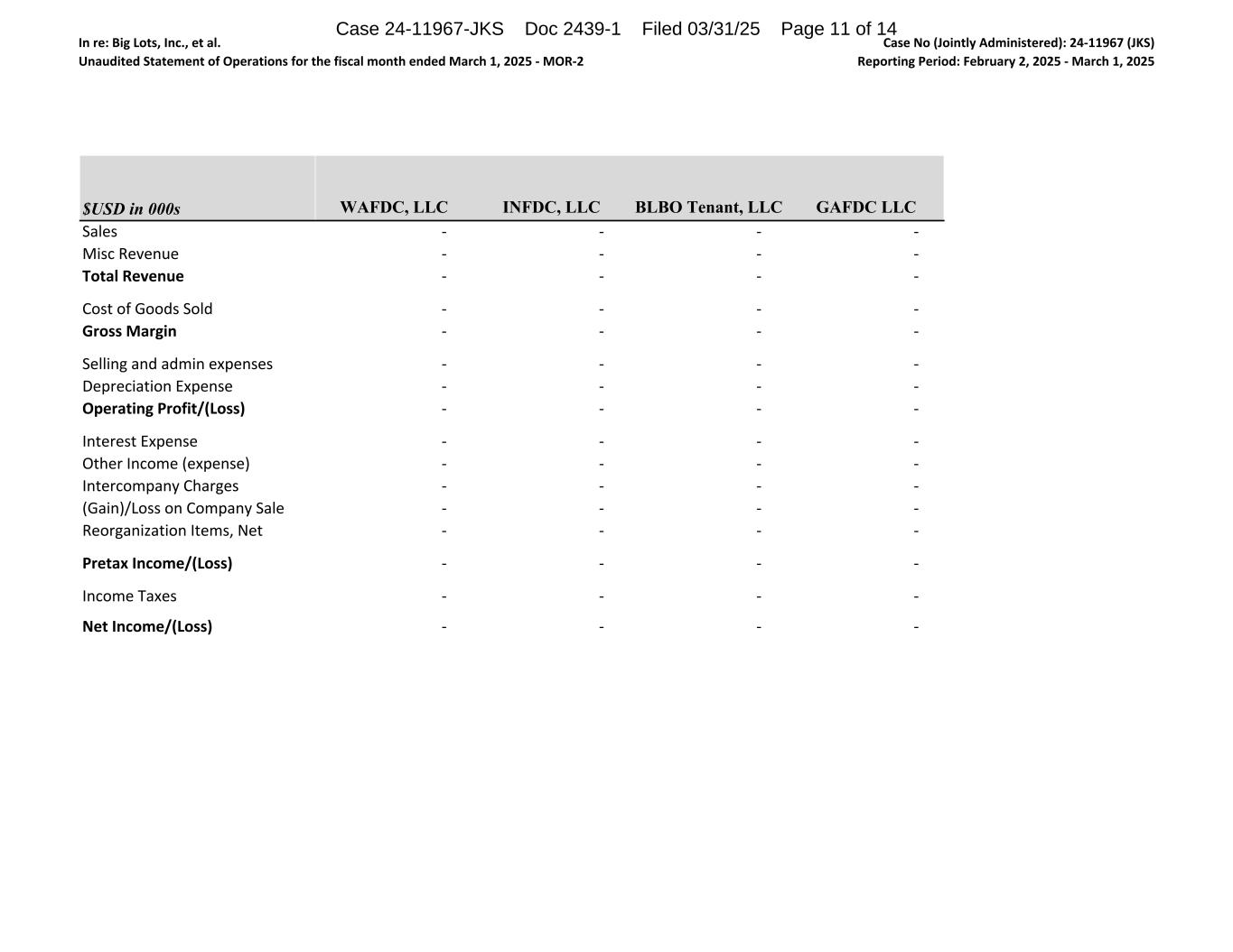 In re: Big Lots, Inc., et al. Unaudited Statement of Operations for the fiscal month ended March 1, 2025 - MOR-2 Case No (Jointly Administered): 24-11967 (JKS) Reporting Period: February 2, 2025 - March 1, 2025 $USD in 000s Sales Misc Revenue Total Revenue Cost of Goods Sold Gross Margin Selling and admin expenses Depreciation Expense Operating Profit/(Loss) Interest Expense Other Income (expense) Intercompany Charges (Gain)/Loss on Company Sale Reorganization Items, Net Pretax Income/(Loss) Income Taxes Net Income/(Loss) WAFDC, LLC INFDC, LLC BLBO Tenant, LLC GAFDC LLC - - - - - - - - - - - - - - - - - - - - - - - - - - - - - - - - - - - - - - - - - - - - - - - - - - - - - - - - - - - - - - - - Case 24-11967-JKS Doc 2439-1 Filed 03/31/25 Page 11 of 14