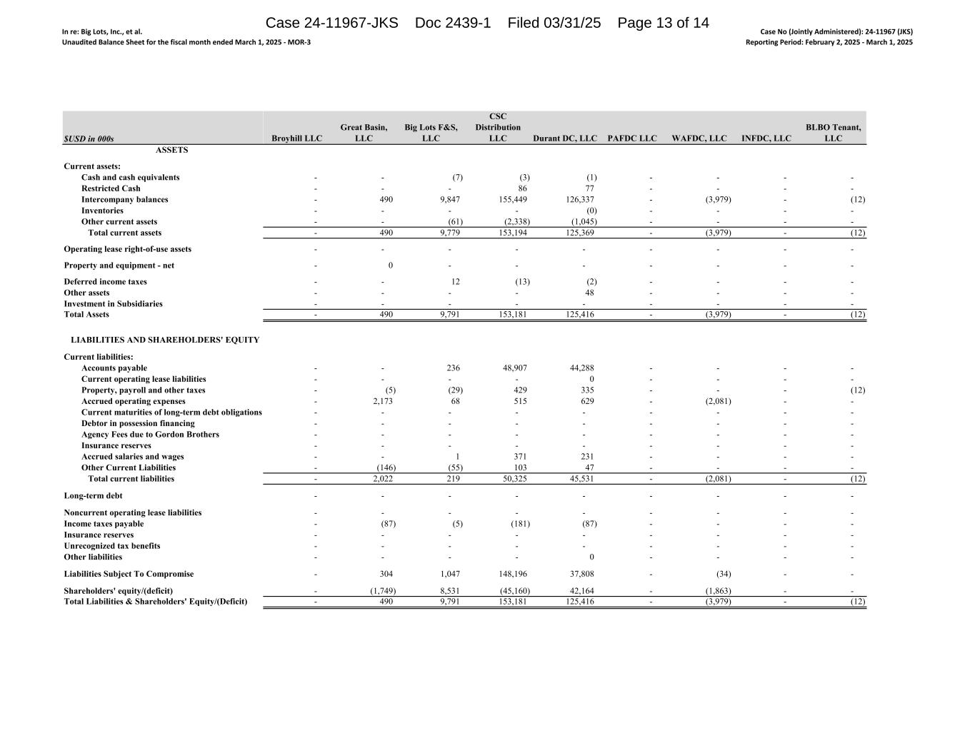 In re: Big Lots, Inc., et al. Unaudited Balance Sheet for the fiscal month ended March 1, 2025 - MOR-3 Case No (Jointly Administered): 24-11967 (JKS) Reporting Period: February 2, 2025 - March 1, 2025 $USD in 000s ASSETS Current assets: Cash and cash equivalents Restricted Cash Intercompany balances Inventories Other current assets Total current assets Operating lease right-of-use assets Property and equipment - net Deferred income taxes Other assets Investment in Subsidiaries Total Assets LIABILITIES AND SHAREHOLDERS' EQUITY Current liabilities: Accounts payable Current operating lease liabilities Property, payroll and other taxes Accrued operating expenses Current maturities of long-term debt obligations Debtor in possession financing Agency Fees due to Gordon Brothers Insurance reserves Accrued salaries and wages Other Current Liabilities Total current liabilities Long-term debt Noncurrent operating lease liabilities Income taxes payable Insurance reserves Unrecognized tax benefits Other liabilities Liabilities Subject To Compromise Shareholders' equity/(deficit) Total Liabilities & Shareholders' Equity/(Deficit) Broyhill LLC Great Basin, LLC Big Lots F&S, LLC CSC Distribution LLC Durant DC, LLC PAFDC LLC WAFDC, LLC INFDC, LLC BLBO Tenant, LLC - - (7) (3) (1) - - - - - - - 86 77 - - - - - 490 9,847 155,449 126,337 - (3,979) - (12) - - - - (0) - - - - - - (61) (2,338) (1,045) - - - - - 490 9,779 153,194 125,369 - (3,979) - (12) - - - - - - - - - - 0 - - - - - - - - - 12 (13) (2) - - - - - - - - 48 - - - - - - - - - - - - - - 490 9,791 153,181 125,416 - (3,979) - (12) - - 236 48,907 44,288 - - - - - - - - 0 - - - - - (5) (29) 429 335 - - - (12) - 2,173 68 515 629 - (2,081) - - - - - - - - - - - - - - - - - - - - - - - - - - - - - - - - - - - - - - - - 1 371 231 - - - - - (146) (55) 103 47 - - - - - 2,022 219 50,325 45,531 - (2,081) - (12) - - - - - - - - - - - - - - - - - - - (87) (5) (181) (87) - - - - - - - - - - - - - - - - - - - - - - - - - - 0 - - - - - 304 1,047 148,196 37,808 - (34) - - - (1,749) 8,531 (45,160) 42,164 - (1,863) - - - 490 9,791 153,181 125,416 - (3,979) - (12) Case 24-11967-JKS Doc 2439-1 Filed 03/31/25 Page 13 of 14