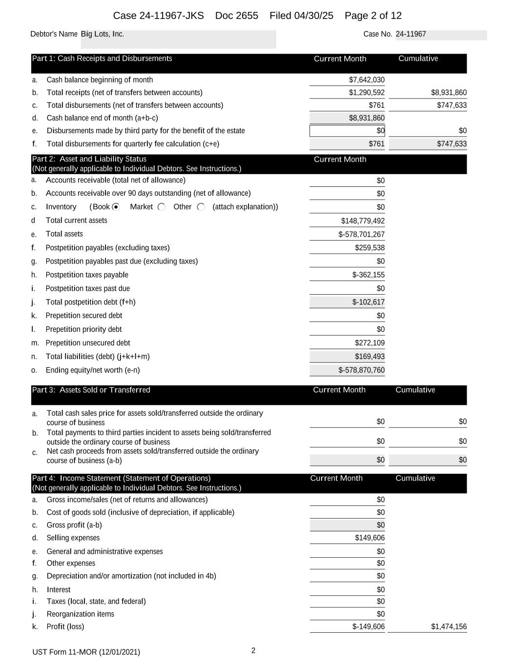 UST Form 11-MOR (12/01/2021) 2 Debtor's Name Big Lots, Inc. Case No. 24-11967 Part 1: Cash Receipts and Disbursements Current Month Cumulative a. Cash balance beginning of month $7,642,030 b. Total receipts (net of transfers between accounts) $1,290,592 $8,931,860 c. Total disbursements (net of transfers between accounts) $761 $747,633 d. Cash balance end of month (a+b-c) $8,931,860 e. Disbursements made by third party for the benefit of the estate $0 $0 f. Total disbursements for quarterly fee calculation (c+e) $761 $747,633 Part 2: Asset and Liability Status Current Month (Not generally applicable to Individual Debtors. See Instructions.) a. Accounts receivable (total net of allowance) $0 b. Accounts receivable over 90 days outstanding (net of allowance) $0 c. Inventory ( (attach explanation))Book Market Other $0 d Total current assets $148,779,492 e. Total assets $-578,701,267 f. Postpetition payables (excluding taxes) $259,538 g. Postpetition payables past due (excluding taxes) $0 h. Postpetition taxes payable $-362,155 i. Postpetition taxes past due $0 j. Total postpetition debt (f+h) $-102,617 k. Prepetition secured debt $0 l. Prepetition priority debt $0 m. Prepetition unsecured debt $272,109 n. Total liabilities (debt) (j+k+l+m) $169,493 o. Ending equity/net worth (e-n) $-578,870,760 Part 3: Assets Sold or Transferred Current Month Cumulative a. Total cash sales price for assets sold/transferred outside the ordinary course of business $0 $0 b. Total payments to third parties incident to assets being sold/transferred outside the ordinary course of business $0 $0 c. Net cash proceeds from assets sold/transferred outside the ordinary course of business (a-b) $0 $0 Part 4: Income Statement (Statement of Operations) Current Month Cumulative (Not generally applicable to Individual Debtors. See Instructions.) a. Gross income/sales (net of returns and allowances) $0 b. Cost of goods sold (inclusive of depreciation, if applicable) $0 c. Gross profit (a-b) $0 d. Selling expenses $149,606 e. General and administrative expenses $0 f. Other expenses $0 g. Depreciation and/or amortization (not included in 4b) $0 h. Interest $0 i. Taxes (local, state, and federal) $0 j. Reorganization items $0 k. Profit (loss) $-149,606 $1,474,156 Case 24-11967-JKS Doc 2655 Filed 04/30/25 Page 2 of 12