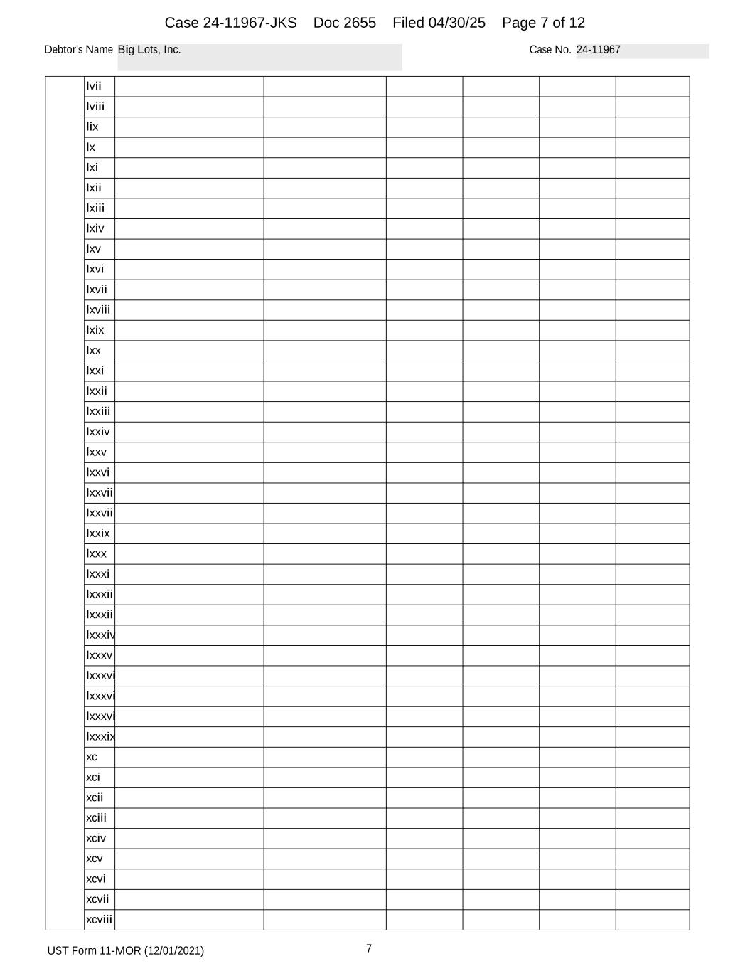 UST Form 11-MOR (12/01/2021) 7 Debtor's Name Big Lots, Inc. Case No. 24-11967 lvii lviii lix lx lxi lxii lxiii lxiv lxv lxvi lxvii lxviii lxix lxx lxxi lxxii lxxiii lxxiv lxxv lxxvi lxxvii lxxvii lxxix lxxx lxxxi lxxxii lxxxii lxxxiv lxxxv lxxxvi lxxxvi lxxxvi lxxxix xc xci xcii xciii xciv xcv xcvi xcvii xcviii Case 24-11967-JKS Doc 2655 Filed 04/30/25 Page 7 of 12