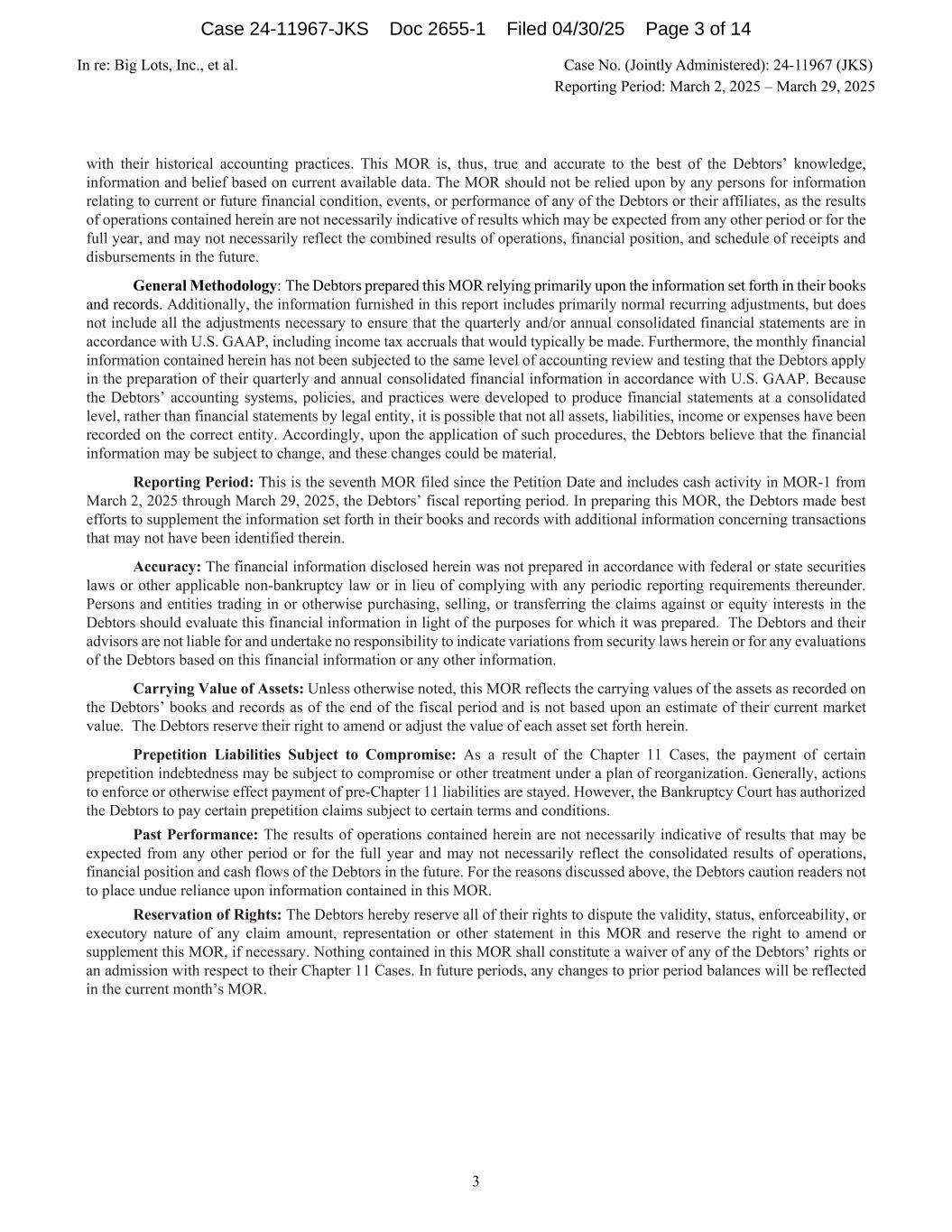 In re: Big Lots, Inc., et al. Case No. (Jointly Administered): 24-11967 (JKS) Reporting Period: March 2, 2025 – March 29, 2025 3 with their historical accounting practices. This MOR is, thus, true and accurate to the best of the Debtors’ knowledge, information and belief based on current available data. The MOR should not be relied upon by any persons for information relating to current or future financial condition, events, or performance of any of the Debtors or their affiliates, as the results of operations contained herein are not necessarily indicative of results which may be expected from any other period or for the full year, and may not necessarily reflect the combined results of operations, financial position, and schedule of receipts and disbursements in the future. General Methodology: The Debtors prepared this MOR relying primarily upon the information set forth in their books and records. Additionally, the information furnished in this report includes primarily normal recurring adjustments, but does not include all the adjustments necessary to ensure that the quarterly and/or annual consolidated financial statements are in accordance with U.S. GAAP, including income tax accruals that would typically be made. Furthermore, the monthly financial information contained herein has not been subjected to the same level of accounting review and testing that the Debtors apply in the preparation of their quarterly and annual consolidated financial information in accordance with U.S. GAAP. Because the Debtors’ accounting systems, policies, and practices were developed to produce financial statements at a consolidated level, rather than financial statements by legal entity, it is possible that not all assets, liabilities, income or expenses have been recorded on the correct entity. Accordingly, upon the application of such procedures, the Debtors believe that the financial information may be subject to change, and these changes could be material. Reporting Period: This is the seventh MOR filed since the Petition Date and includes cash activity in MOR-1 from March 2, 2025 through March 29, 2025, the Debtors’ fiscal reporting period. In preparing this MOR, the Debtors made best efforts to supplement the information set forth in their books and records with additional information concerning transactions that may not have been identified therein. Accuracy: The financial information disclosed herein was not prepared in accordance with federal or state securities laws or other applicable non-bankruptcy law or in lieu of complying with any periodic reporting requirements thereunder. Persons and entities trading in or otherwise purchasing, selling, or transferring the claims against or equity interests in the Debtors should evaluate this financial information in light of the purposes for which it was prepared. The Debtors and their advisors are not liable for and undertake no responsibility to indicate variations from security laws herein or for any evaluations of the Debtors based on this financial information or any other information. Carrying Value of Assets: Unless otherwise noted, this MOR reflects the carrying values of the assets as recorded on the Debtors’ books and records as of the end of the fiscal period and is not based upon an estimate of their current market value. The Debtors reserve their right to amend or adjust the value of each asset set forth herein. Prepetition Liabilities Subject to Compromise: As a result of the Chapter 11 Cases, the payment of certain prepetition indebtedness may be subject to compromise or other treatment under a plan of reorganization. Generally, actions to enforce or otherwise effect payment of pre-Chapter 11 liabilities are stayed. However, the Bankruptcy Court has authorized the Debtors to pay certain prepetition claims subject to certain terms and conditions. Past Performance: The results of operations contained herein are not necessarily indicative of results that may be expected from any other period or for the full year and may not necessarily reflect the consolidated results of operations, financial position and cash flows of the Debtors in the future. For the reasons discussed above, the Debtors caution readers not to place undue reliance upon information contained in this MOR. Reservation of Rights: The Debtors hereby reserve all of their rights to dispute the validity, status, enforceability, or executory nature of any claim amount, representation or other statement in this MOR and reserve the right to amend or supplement this MOR, if necessary. Nothing contained in this MOR shall constitute a waiver of any of the Debtors’ rights or an admission with respect to their Chapter 11 Cases. In future periods, any changes to prior period balances will be reflected in the current month’s MOR. Case 24-11967-JKS Doc 2655-1 Filed 04/30/25 Page 3 of 14