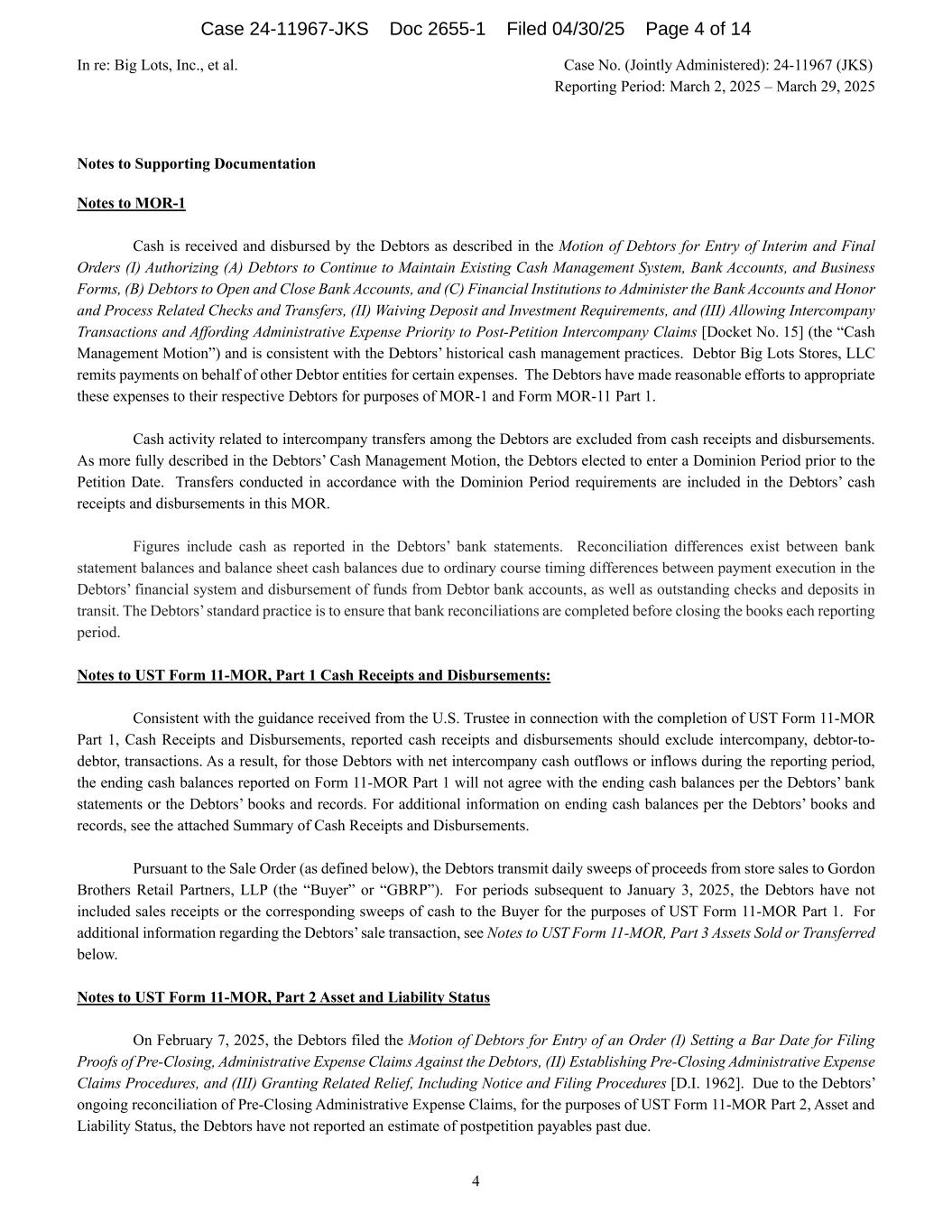 In re: Big Lots, Inc., et al. Case No. (Jointly Administered): 24-11967 (JKS) Reporting Period: March 2, 2025 – March 29, 2025 4 Notes to Supporting Documentation Notes to MOR-1 Cash is received and disbursed by the Debtors as described in the Motion of Debtors for Entry of Interim and Final Orders (I) Authorizing (A) Debtors to Continue to Maintain Existing Cash Management System, Bank Accounts, and Business Forms, (B) Debtors to Open and Close Bank Accounts, and (C) Financial Institutions to Administer the Bank Accounts and Honor and Process Related Checks and Transfers, (II) Waiving Deposit and Investment Requirements, and (III) Allowing Intercompany Transactions and Affording Administrative Expense Priority to Post-Petition Intercompany Claims [Docket No. 15] (the “Cash Management Motion”) and is consistent with the Debtors’ historical cash management practices. Debtor Big Lots Stores, LLC remits payments on behalf of other Debtor entities for certain expenses. The Debtors have made reasonable efforts to appropriate these expenses to their respective Debtors for purposes of MOR-1 and Form MOR-11 Part 1. Cash activity related to intercompany transfers among the Debtors are excluded from cash receipts and disbursements. As more fully described in the Debtors’ Cash Management Motion, the Debtors elected to enter a Dominion Period prior to the Petition Date. Transfers conducted in accordance with the Dominion Period requirements are included in the Debtors’ cash receipts and disbursements in this MOR. Figures include cash as reported in the Debtors’ bank statements. Reconciliation differences exist between bank statement balances and balance sheet cash balances due to ordinary course timing differences between payment execution in the Debtors’ financial system and disbursement of funds from Debtor bank accounts, as well as outstanding checks and deposits in transit. The Debtors’ standard practice is to ensure that bank reconciliations are completed before closing the books each reporting period. Notes to UST Form 11-MOR, Part 1 Cash Receipts and Disbursements: Consistent with the guidance received from the U.S. Trustee in connection with the completion of UST Form 11-MOR Part 1, Cash Receipts and Disbursements, reported cash receipts and disbursements should exclude intercompany, debtor-to- debtor, transactions. As a result, for those Debtors with net intercompany cash outflows or inflows during the reporting period, the ending cash balances reported on Form 11-MOR Part 1 will not agree with the ending cash balances per the Debtors’ bank statements or the Debtors’ books and records. For additional information on ending cash balances per the Debtors’ books and records, see the attached Summary of Cash Receipts and Disbursements. Pursuant to the Sale Order (as defined below), the Debtors transmit daily sweeps of proceeds from store sales to Gordon Brothers Retail Partners, LLP (the “Buyer” or “GBRP”). For periods subsequent to January 3, 2025, the Debtors have not included sales receipts or the corresponding sweeps of cash to the Buyer for the purposes of UST Form 11-MOR Part 1. For additional information regarding the Debtors’ sale transaction, see Notes to UST Form 11-MOR, Part 3 Assets Sold or Transferred below. Notes to UST Form 11-MOR, Part 2 Asset and Liability Status On February 7, 2025, the Debtors filed the Motion of Debtors for Entry of an Order (I) Setting a Bar Date for Filing Proofs of Pre-Closing, Administrative Expense Claims Against the Debtors, (II) Establishing Pre-Closing Administrative Expense Claims Procedures, and (III) Granting Related Relief, Including Notice and Filing Procedures [D.I. 1962]. Due to the Debtors’ ongoing reconciliation of Pre-Closing Administrative Expense Claims, for the purposes of UST Form 11-MOR Part 2, Asset and Liability Status, the Debtors have not reported an estimate of postpetition payables past due. Case 24-11967-JKS Doc 2655-1 Filed 04/30/25 Page 4 of 14