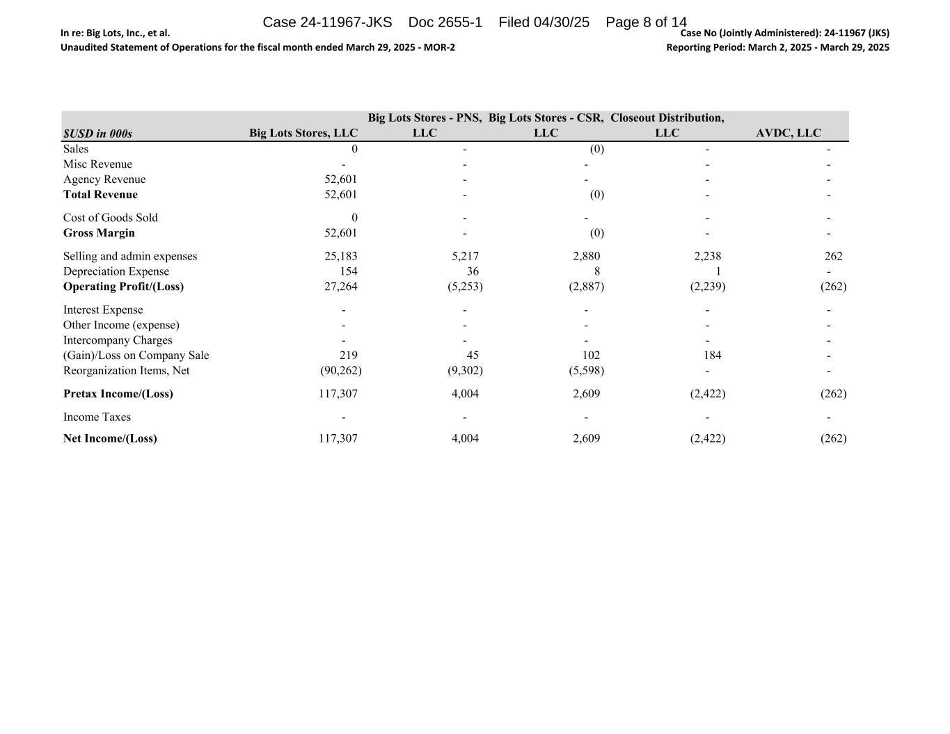 In re: Big Lots, Inc., et al. Unaudited Statement of Operations for the fiscal month ended March 29, 2025 - MOR-2 Case No (Jointly Administered): 24-11967 (JKS) Reporting Period: March 2, 2025 - March 29, 2025 $USD in 000s Big Lots Stores, LLC Big Lots Stores - PNS, LLC Big Lots Stores - CSR, LLC Closeout Distribution, LLC AVDC, LLC Sales 0 - (0) - - Misc Revenue - - - - - Agency Revenue 52,601 - - - - Total Revenue 52,601 - (0) - - Cost of Goods Sold 0 - - - - Gross Margin 52,601 - (0) - - Selling and admin expenses 25,183 5,217 2,880 2,238 262 Depreciation Expense 154 36 8 1 - Operating Profit/(Loss) 27,264 (5,253) (2,887) (2,239) (262) Interest Expense - - - - - Other Income (expense) - - - - - Intercompany Charges - - - - - (Gain)/Loss on Company Sale 219 45 102 184 - Reorganization Items, Net (90,262) (9,302) (5,598) - - Pretax Income/(Loss) 117,307 4,004 2,609 (2,422) (262) Income Taxes - - - - - Net Income/(Loss) 117,307 4,004 2,609 (2,422) (262) Case 24-11967-JKS Doc 2655-1 Filed 04/30/25 Page 8 of 14