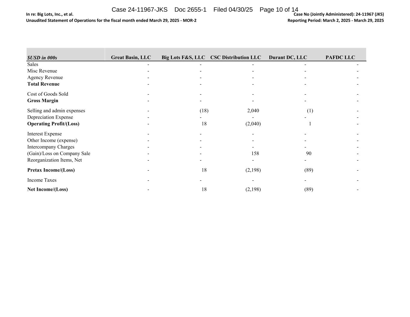 In re: Big Lots, Inc., et al. Unaudited Statement of Operations for the fiscal month ended March 29, 2025 - MOR-2 Case No (Jointly Administered): 24-11967 (JKS) Reporting Period: March 2, 2025 - March 29, 2025 $USD in 000s Sales Misc Revenue Agency Revenue Total Revenue Cost of Goods Sold Gross Margin Selling and admin expenses Depreciation Expense Operating Profit/(Loss) Interest Expense Other Income (expense) Intercompany Charges (Gain)/Loss on Company Sale Reorganization Items, Net Pretax Income/(Loss) Income Taxes Net Income/(Loss) Great Basin, LLC Big Lots F&S, LLC CSC Distribution LLC Durant DC, LLC PAFDC LLC - - - - - - - - - - - - - - - - - - - - - - - - - - - - - - - (18) 2,040 (1) - - - - - - - 18 (2,040) 1 - - - - - - - - - - - - - - - - - - 158 90 - - - - - - - 18 (2,198) (89) - - - - - - - 18 (2,198) (89) - Case 24-11967-JKS Doc 2655-1 Filed 04/30/25 Page 10 of 14
