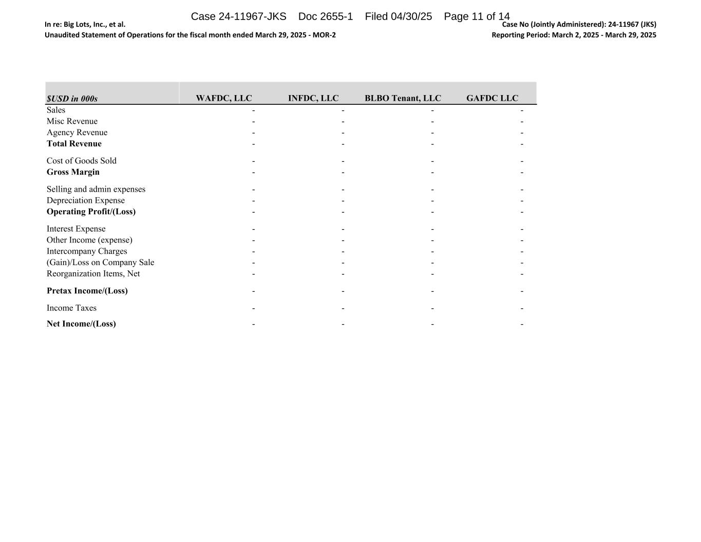 In re: Big Lots, Inc., et al. Unaudited Statement of Operations for the fiscal month ended March 29, 2025 - MOR-2 Case No (Jointly Administered): 24-11967 (JKS) Reporting Period: March 2, 2025 - March 29, 2025 $USD in 000s Sales Misc Revenue Agency Revenue Total Revenue Cost of Goods Sold Gross Margin Selling and admin expenses Depreciation Expense Operating Profit/(Loss) Interest Expense Other Income (expense) Intercompany Charges (Gain)/Loss on Company Sale Reorganization Items, Net Pretax Income/(Loss) Income Taxes Net Income/(Loss) WAFDC, LLC INFDC, LLC BLBO Tenant, LLC GAFDC LLC - - - - - - - - - - - - - - - - - - - - - - - - - - - - - - - - - - - - - - - - - - - - - - - - - - - - - - - - - - - - - - - - - - - - Case 24-11967-JKS Doc 2655-1 Filed 04/30/25 Page 11 of 14