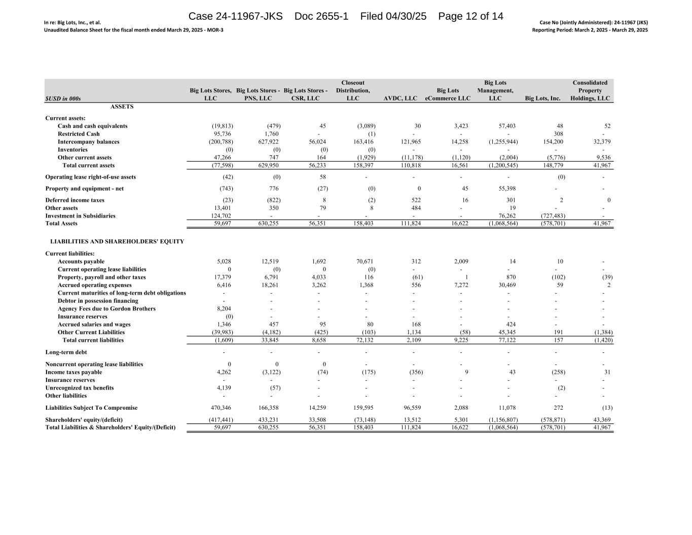 In re: Big Lots, Inc., et al. Unaudited Balance Sheet for the fiscal month ended March 29, 2025 - MOR-3 Case No (Jointly Administered): 24-11967 (JKS) Reporting Period: March 2, 2025 - March 29, 2025 $USD in 000s Big Lots Stores, LLC Big Lots Stores - PNS, LLC Big Lots Stores - CSR, LLC Closeout Distribution, LLC AVDC, LLC Big Lots eCommerce LLC Big Lots Management, LLC Big Lots, Inc. Consolidated Property Holdings, LLC ASSETS Current assets: Cash and cash equivalents (19,813) (479) 45 (3,089) 30 3,423 57,403 48 52 Restricted Cash 95,736 1,760 - (1) - - - 308 - Intercompany balances (200,788) 627,922 56,024 163,416 121,965 14,258 (1,255,944) 154,200 32,379 Inventories (0) (0) (0) (0) - - - - - Other current assets 47,266 747 164 (1,929) (11,178) (1,120) (2,004) (5,776) 9,536 Total current assets (77,598) 629,950 56,233 158,397 110,818 16,561 (1,200,545) 148,779 41,967 Operating lease right-of-use assets (42) (0) 58 - - - - (0) - Property and equipment - net (743) 776 (27) (0) 0 45 55,398 - - Deferred income taxes (23) (822) 8 (2) 522 16 301 2 0 Other assets 13,401 350 79 8 484 - 19 - - Investment in Subsidiaries 124,702 - - - - - 76,262 (727,483) - Total Assets 59,697 630,255 56,351 158,403 111,824 16,622 (1,068,564) (578,701) 41,967 LIABILITIES AND SHAREHOLDERS' EQUITY Current liabilities: Accounts payable 5,028 12,519 1,692 70,671 312 2,009 14 10 - Current operating lease liabilities 0 (0) 0 (0) - - - - - Property, payroll and other taxes 17,379 6,791 4,033 116 (61) 1 870 (102) (39) Accrued operating expenses 6,416 18,261 3,262 1,368 556 7,272 30,469 59 2 Current maturities of long-term debt obligations - - - - - - - - - Debtor in possession financing - - - - - - - - - Agency Fees due to Gordon Brothers 8,204 - - - - - - - - Insurance reserves (0) - - - - - - - - Accrued salaries and wages 1,346 457 95 80 168 - 424 - - Other Current Liabilities (39,983) (4,182) (425) (103) 1,134 (58) 45,345 191 (1,384) Total current liabilities (1,609) 33,845 8,658 72,132 2,109 9,225 77,122 157 (1,420) Long-term debt - - - - - - - - - Noncurrent operating lease liabilities 0 0 0 - - - - - - Income taxes payable 4,262 (3,122) (74) (175) (356) 9 43 (258) 31 Insurance reserves - - - - - - - - - Unrecognized tax benefits 4,139 (57) - - - - - (2) - Other liabilities - - - - - - - - - Liabilities Subject To Compromise 470,346 166,358 14,259 159,595 96,559 2,088 11,078 272 (13) Shareholders' equity/(deficit) (417,441) 433,231 33,508 (73,148) 13,512 5,301 (1,156,807) (578,871) 43,369 Total Liabilities & Shareholders' Equity/(Deficit) 59,697 630,255 56,351 158,403 111,824 16,622 (1,068,564) (578,701) 41,967 Case 24-11967-JKS Doc 2655-1 Filed 04/30/25 Page 12 of 14