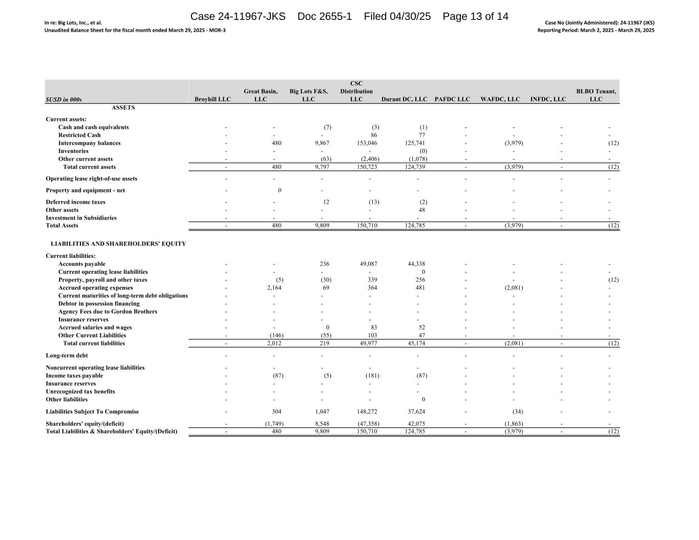 In re: Big Lots, Inc., et al. Unaudited Balance Sheet for the fiscal month ended March 29, 2025 - MOR-3 Case No (Jointly Administered): 24-11967 (JKS) Reporting Period: March 2, 2025 - March 29, 2025 $USD in 000s ASSETS Current assets: Cash and cash equivalents Restricted Cash Intercompany balances Inventories Other current assets Total current assets Operating lease right-of-use assets Property and equipment - net Deferred income taxes Other assets Investment in Subsidiaries Total Assets LIABILITIES AND SHAREHOLDERS' EQUITY Current liabilities: Accounts payable Current operating lease liabilities Property, payroll and other taxes Accrued operating expenses Current maturities of long-term debt obligations Debtor in possession financing Agency Fees due to Gordon Brothers Insurance reserves Accrued salaries and wages Other Current Liabilities Total current liabilities Long-term debt Noncurrent operating lease liabilities Income taxes payable Insurance reserves Unrecognized tax benefits Other liabilities Liabilities Subject To Compromise Shareholders' equity/(deficit) Total Liabilities & Shareholders' Equity/(Deficit) Broyhill LLC Great Basin, LLC Big Lots F&S, LLC CSC Distribution LLC Durant DC, LLC PAFDC LLC WAFDC, LLC INFDC, LLC BLBO Tenant, LLC - - (7) (3) (1) - - - - - - - 86 77 - - - - - 480 9,867 153,046 125,741 - (3,979) - (12) - - - - (0) - - - - - - (63) (2,406) (1,078) - - - - - 480 9,797 150,723 124,739 - (3,979) - (12) - - - - - - - - - - 0 - - - - - - - - - 12 (13) (2) - - - - - - - - 48 - - - - - - - - - - - - - - 480 9,809 150,710 124,785 - (3,979) - (12) - - 236 49,087 44,338 - - - - - - - - 0 - - - - - (5) (30) 339 256 - - - (12) - 2,164 69 364 481 - (2,081) - - - - - - - - - - - - - - - - - - - - - - - - - - - - - - - - - - - - - - - - 0 83 52 - - - - - (146) (55) 103 47 - - - - - 2,012 219 49,977 45,174 - (2,081) - (12) - - - - - - - - - - - - - - - - - - - (87) (5) (181) (87) - - - - - - - - - - - - - - - - - - - - - - - - - - 0 - - - - - 304 1,047 148,272 37,624 - (34) - - - (1,749) 8,548 (47,358) 42,075 - (1,863) - - - 480 9,809 150,710 124,785 - (3,979) - (12) Case 24-11967-JKS Doc 2655-1 Filed 04/30/25 Page 13 of 14