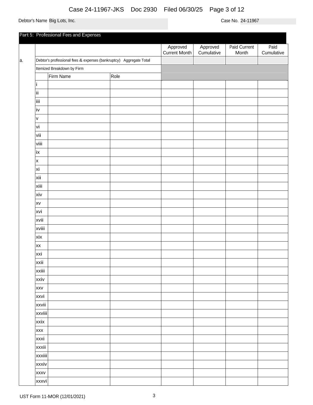 UST Form 11-MOR (12/01/2021) 5 Debtor's Name Big Lots, Inc. Case No. 24-11967 lxxix lxxx lxxxi lxxxii lxxxii lxxxiv lxxxv lxxxvi lxxxvi lxxxvi lxxxix xc xci xcii xciii xciv xcv xcvi xcvii xcviii xcix c ci Approved Current Month Approved Cumulative Paid Current Month Paid Cumulative b. Debtor's professional fees & expenses (nonbankruptcy) Aggregate Total Itemized Breakdown by Firm Firm Name Role i ii iii iv v vi vii viii ix x xi xii xiii xiv Case 24-11967-JKS Doc 2930 Filed 06/30/25 Page 5 of 12