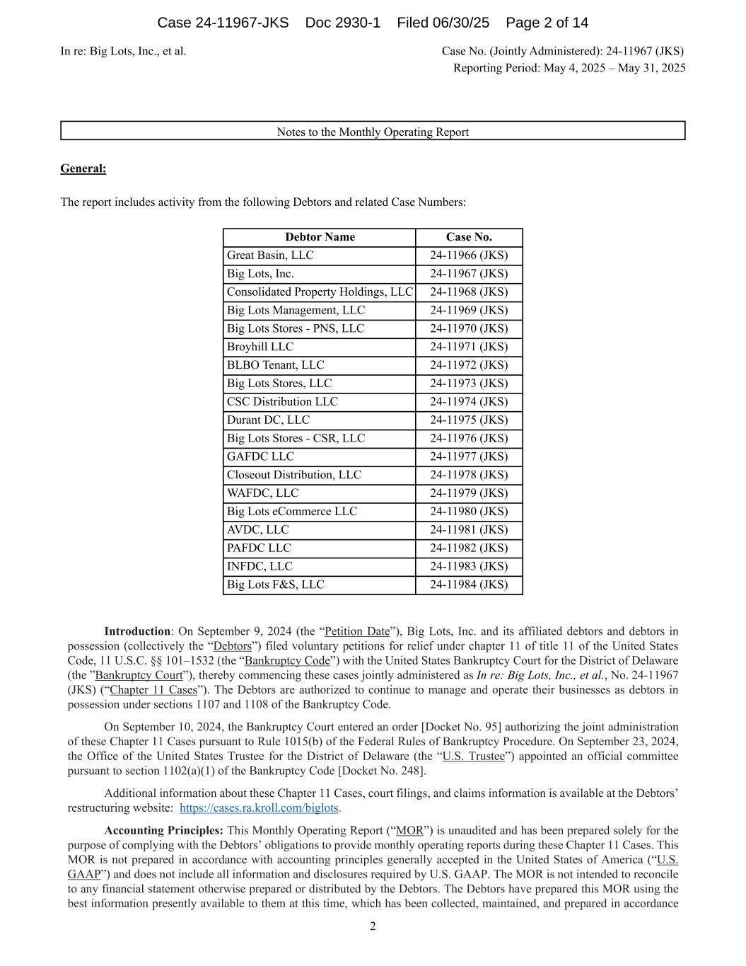 In re: Big Lots, Inc., et al. Case No. (Jointly Administered): 24-11967 (JKS) Reporting Period: May 4, 2025 – May 31, 2025 2 Notes to the Monthly Operating Report General: The report includes activity from the following Debtors and related Case Numbers: Debtor Name Case No. Great Basin, LLC 24-11966 (JKS) Big Lots, Inc. 24-11967 (JKS) Consolidated Property Holdings, LLC 24-11968 (JKS) Big Lots Management, LLC 24-11969 (JKS) Big Lots Stores - PNS, LLC 24-11970 (JKS) Broyhill LLC 24-11971 (JKS) BLBO Tenant, LLC 24-11972 (JKS) Big Lots Stores, LLC 24-11973 (JKS) CSC Distribution LLC 24-11974 (JKS) Durant DC, LLC 24-11975 (JKS) Big Lots Stores - CSR, LLC 24-11976 (JKS) GAFDC LLC 24-11977 (JKS) Closeout Distribution, LLC 24-11978 (JKS) WAFDC, LLC 24-11979 (JKS) Big Lots eCommerce LLC 24-11980 (JKS) AVDC, LLC 24-11981 (JKS) PAFDC LLC 24-11982 (JKS) INFDC, LLC 24-11983 (JKS) Big Lots F&S, LLC 24-11984 (JKS) Introduction: On September 9, 2024 (the “Petition Date”), Big Lots, Inc. and its affiliated debtors and debtors in possession (collectively the “Debtors”) filed voluntary petitions for relief under chapter 11 of title 11 of the United States Code, 11 U.S.C. §§ 101–1532 (the “Bankruptcy Code”) with the United States Bankruptcy Court for the District of Delaware (the ”Bankruptcy Court”), thereby commencing these cases jointly administered as In re: Big Lots, Inc., et al., No. 24-11967 (JKS) (“Chapter 11 Cases”). The Debtors are authorized to continue to manage and operate their businesses as debtors in possession under sections 1107 and 1108 of the Bankruptcy Code. On September 10, 2024, the Bankruptcy Court entered an order [Docket No. 95] authorizing the joint administration of these Chapter 11 Cases pursuant to Rule 1015(b) of the Federal Rules of Bankruptcy Procedure. On September 23, 2024, the Office of the United States Trustee for the District of Delaware (the “U.S. Trustee”) appointed an official committee pursuant to section 1102(a)(1) of the Bankruptcy Code [Docket No. 248]. Additional information about these Chapter 11 Cases, court filings, and claims information is available at the Debtors’ restructuring website: https://cases.ra.kroll.com/biglots. Accounting Principles: This Monthly Operating Report (“MOR”) is unaudited and has been prepared solely for the purpose of complying with the Debtors’ obligations to provide monthly operating reports during these Chapter 11 Cases. This MOR is not prepared in accordance with accounting principles generally accepted in the United States of America (“U.S. GAAP”) and does not include all information and disclosures required by U.S. GAAP. The MOR is not intended to reconcile to any financial statement otherwise prepared or distributed by the Debtors. The Debtors have prepared this MOR using the best information presently available to them at this time, which has been collected, maintained, and prepared in accordance Case 24-11967-JKS Doc 2930-1 Filed 06/30/25 Page 2 of 14