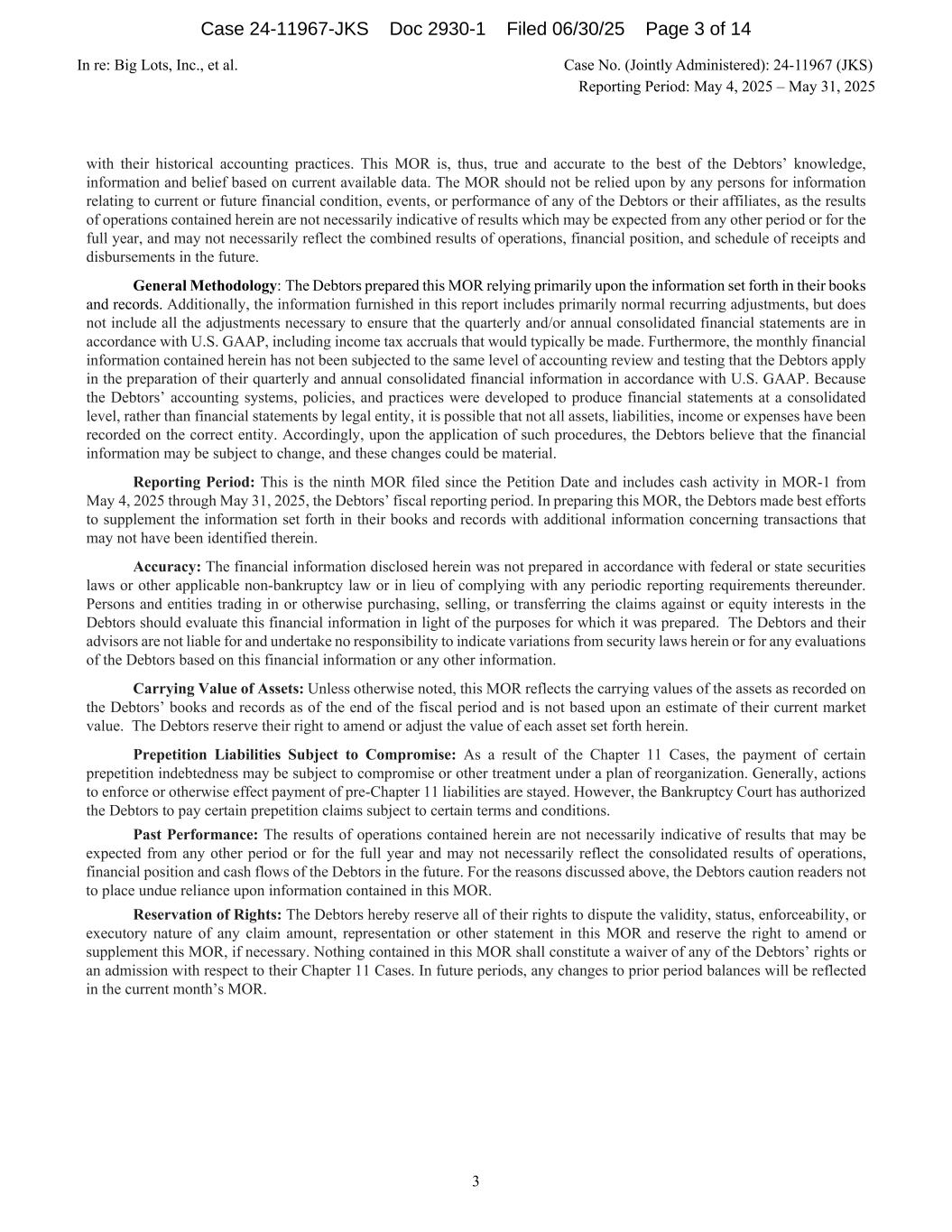 In re: Big Lots, Inc., et al. Case No. (Jointly Administered): 24-11967 (JKS) Reporting Period: May 4, 2025 – May 31, 2025 3 with their historical accounting practices. This MOR is, thus, true and accurate to the best of the Debtors’ knowledge, information and belief based on current available data. The MOR should not be relied upon by any persons for information relating to current or future financial condition, events, or performance of any of the Debtors or their affiliates, as the results of operations contained herein are not necessarily indicative of results which may be expected from any other period or for the full year, and may not necessarily reflect the combined results of operations, financial position, and schedule of receipts and disbursements in the future. General Methodology: The Debtors prepared this MOR relying primarily upon the information set forth in their books and records. Additionally, the information furnished in this report includes primarily normal recurring adjustments, but does not include all the adjustments necessary to ensure that the quarterly and/or annual consolidated financial statements are in accordance with U.S. GAAP, including income tax accruals that would typically be made. Furthermore, the monthly financial information contained herein has not been subjected to the same level of accounting review and testing that the Debtors apply in the preparation of their quarterly and annual consolidated financial information in accordance with U.S. GAAP. Because the Debtors’ accounting systems, policies, and practices were developed to produce financial statements at a consolidated level, rather than financial statements by legal entity, it is possible that not all assets, liabilities, income or expenses have been recorded on the correct entity. Accordingly, upon the application of such procedures, the Debtors believe that the financial information may be subject to change, and these changes could be material. Reporting Period: This is the ninth MOR filed since the Petition Date and includes cash activity in MOR-1 from May 4, 2025 through May 31, 2025, the Debtors’ fiscal reporting period. In preparing this MOR, the Debtors made best efforts to supplement the information set forth in their books and records with additional information concerning transactions that may not have been identified therein. Accuracy: The financial information disclosed herein was not prepared in accordance with federal or state securities laws or other applicable non-bankruptcy law or in lieu of complying with any periodic reporting requirements thereunder. Persons and entities trading in or otherwise purchasing, selling, or transferring the claims against or equity interests in the Debtors should evaluate this financial information in light of the purposes for which it was prepared. The Debtors and their advisors are not liable for and undertake no responsibility to indicate variations from security laws herein or for any evaluations of the Debtors based on this financial information or any other information. Carrying Value of Assets: Unless otherwise noted, this MOR reflects the carrying values of the assets as recorded on the Debtors’ books and records as of the end of the fiscal period and is not based upon an estimate of their current market value. The Debtors reserve their right to amend or adjust the value of each asset set forth herein. Prepetition Liabilities Subject to Compromise: As a result of the Chapter 11 Cases, the payment of certain prepetition indebtedness may be subject to compromise or other treatment under a plan of reorganization. Generally, actions to enforce or otherwise effect payment of pre-Chapter 11 liabilities are stayed. However, the Bankruptcy Court has authorized the Debtors to pay certain prepetition claims subject to certain terms and conditions. Past Performance: The results of operations contained herein are not necessarily indicative of results that may be expected from any other period or for the full year and may not necessarily reflect the consolidated results of operations, financial position and cash flows of the Debtors in the future. For the reasons discussed above, the Debtors caution readers not to place undue reliance upon information contained in this MOR. Reservation of Rights: The Debtors hereby reserve all of their rights to dispute the validity, status, enforceability, or executory nature of any claim amount, representation or other statement in this MOR and reserve the right to amend or supplement this MOR, if necessary. Nothing contained in this MOR shall constitute a waiver of any of the Debtors’ rights or an admission with respect to their Chapter 11 Cases. In future periods, any changes to prior period balances will be reflected in the current month’s MOR. Case 24-11967-JKS Doc 2930-1 Filed 06/30/25 Page 3 of 14