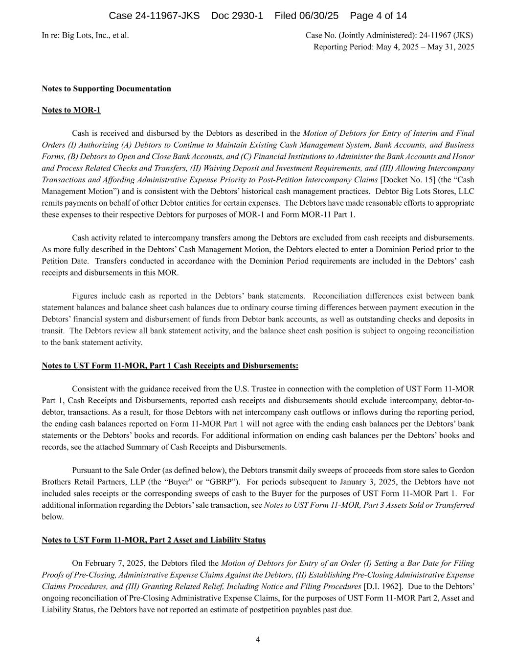 In re: Big Lots, Inc., et al. Case No. (Jointly Administered): 24-11967 (JKS) Reporting Period: May 4, 2025 – May 31, 2025 4 Notes to Supporting Documentation Notes to MOR-1 Cash is received and disbursed by the Debtors as described in the Motion of Debtors for Entry of Interim and Final Orders (I) Authorizing (A) Debtors to Continue to Maintain Existing Cash Management System, Bank Accounts, and Business Forms, (B) Debtors to Open and Close Bank Accounts, and (C) Financial Institutions to Administer the Bank Accounts and Honor and Process Related Checks and Transfers, (II) Waiving Deposit and Investment Requirements, and (III) Allowing Intercompany Transactions and Affording Administrative Expense Priority to Post-Petition Intercompany Claims [Docket No. 15] (the “Cash Management Motion”) and is consistent with the Debtors’ historical cash management practices. Debtor Big Lots Stores, LLC remits payments on behalf of other Debtor entities for certain expenses. The Debtors have made reasonable efforts to appropriate these expenses to their respective Debtors for purposes of MOR-1 and Form MOR-11 Part 1. Cash activity related to intercompany transfers among the Debtors are excluded from cash receipts and disbursements. As more fully described in the Debtors’ Cash Management Motion, the Debtors elected to enter a Dominion Period prior to the Petition Date. Transfers conducted in accordance with the Dominion Period requirements are included in the Debtors’ cash receipts and disbursements in this MOR. Figures include cash as reported in the Debtors’ bank statements. Reconciliation differences exist between bank statement balances and balance sheet cash balances due to ordinary course timing differences between payment execution in the Debtors’ financial system and disbursement of funds from Debtor bank accounts, as well as outstanding checks and deposits in transit. The Debtors review all bank statement activity, and the balance sheet cash position is subject to ongoing reconciliation to the bank statement activity. Notes to UST Form 11-MOR, Part 1 Cash Receipts and Disbursements: Consistent with the guidance received from the U.S. Trustee in connection with the completion of UST Form 11-MOR Part 1, Cash Receipts and Disbursements, reported cash receipts and disbursements should exclude intercompany, debtor-to- debtor, transactions. As a result, for those Debtors with net intercompany cash outflows or inflows during the reporting period, the ending cash balances reported on Form 11-MOR Part 1 will not agree with the ending cash balances per the Debtors’ bank statements or the Debtors’ books and records. For additional information on ending cash balances per the Debtors’ books and records, see the attached Summary of Cash Receipts and Disbursements. Pursuant to the Sale Order (as defined below), the Debtors transmit daily sweeps of proceeds from store sales to Gordon Brothers Retail Partners, LLP (the “Buyer” or “GBRP”). For periods subsequent to January 3, 2025, the Debtors have not included sales receipts or the corresponding sweeps of cash to the Buyer for the purposes of UST Form 11-MOR Part 1. For additional information regarding the Debtors’ sale transaction, see Notes to UST Form 11-MOR, Part 3 Assets Sold or Transferred below. Notes to UST Form 11-MOR, Part 2 Asset and Liability Status On February 7, 2025, the Debtors filed the Motion of Debtors for Entry of an Order (I) Setting a Bar Date for Filing Proofs of Pre-Closing, Administrative Expense Claims Against the Debtors, (II) Establishing Pre-Closing Administrative Expense Claims Procedures, and (III) Granting Related Relief, Including Notice and Filing Procedures [D.I. 1962]. Due to the Debtors’ ongoing reconciliation of Pre-Closing Administrative Expense Claims, for the purposes of UST Form 11-MOR Part 2, Asset and Liability Status, the Debtors have not reported an estimate of postpetition payables past due. Case 24-11967-JKS Doc 2930-1 Filed 06/30/25 Page 4 of 14