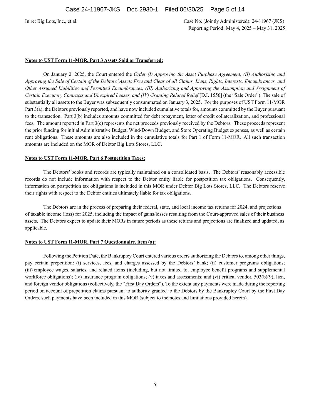 In re: Big Lots, Inc., et al. Case No. (Jointly Administered): 24-11967 (JKS) Reporting Period: May 4, 2025 – May 31, 2025 5 Notes to UST Form 11-MOR, Part 3 Assets Sold or Transferred: On January 2, 2025, the Court entered the Order (I) Approving the Asset Purchase Agreement, (II) Authorizing and Approving the Sale of Certain of the Debtors’ Assets Free and Clear of all Claims, Liens, Rights, Interests, Encumbrances, and Other Assumed Liabilities and Permitted Encumbrances, (III) Authorizing and Approving the Assumption and Assignment of Certain Executory Contracts and Unexpired Leases, and (IV) Granting Related Relief [D.I. 1556] (the “Sale Order”). The sale of substantially all assets to the Buyer was subsequently consummated on January 3, 2025. For the purposes of UST Form 11-MOR Part 3(a), the Debtors previously reported, and have now included cumulative totals for, amounts committed by the Buyer pursuant to the transaction. Part 3(b) includes amounts committed for debt repayment, letter of credit collateralization, and professional fees. The amount reported in Part 3(c) represents the net proceeds previously received by the Debtors. These proceeds represent the prior funding for initial Administrative Budget, Wind-Down Budget, and Store Operating Budget expenses, as well as certain rent obligations. These amounts are also included in the cumulative totals for Part 1 of Form 11-MOR. All such transaction amounts are included on the MOR of Debtor Big Lots Stores, LLC. Notes to UST Form 11-MOR, Part 6 Postpetition Taxes: The Debtors’ books and records are typically maintained on a consolidated basis. The Debtors’ reasonably accessible records do not include information with respect to the Debtor entity liable for postpetition tax obligations. Consequently, information on postpetition tax obligations is included in this MOR under Debtor Big Lots Stores, LLC. The Debtors reserve their rights with respect to the Debtor entities ultimately liable for tax obligations. The Debtors are in the process of preparing their federal, state, and local income tax returns for 2024, and projections of taxable income (loss) for 2025, including the impact of gains/losses resulting from the Court-approved sales of their business assets. The Debtors expect to update their MORs in future periods as these returns and projections are finalized and updated, as applicable. Notes to UST Form 11-MOR, Part 7 Questionnaire, item (a): Following the Petition Date, the Bankruptcy Court entered various orders authorizing the Debtors to, among other things, pay certain prepetition: (i) services, fees, and charges assessed by the Debtors’ bank; (ii) customer programs obligations; (iii) employee wages, salaries, and related items (including, but not limited to, employee benefit programs and supplemental workforce obligations); (iv) insurance program obligations; (v) taxes and assessments; and (vi) critical vendor, 503(b)(9), lien, and foreign vendor obligations (collectively, the “First Day Orders”). To the extent any payments were made during the reporting period on account of prepetition claims pursuant to authority granted to the Debtors by the Bankruptcy Court by the First Day Orders, such payments have been included in this MOR (subject to the notes and limitations provided herein). Case 24-11967-JKS Doc 2930-1 Filed 06/30/25 Page 5 of 14
