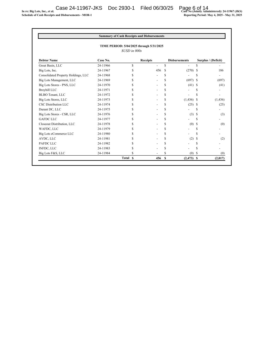 In re: Big Lots, Inc., et al. Schedule of Cash Receipts and Disbursements - MOR-1 Case No (Jointly Administered): 24-11967 (JKS) Reporting Period: May 4, 2025 - May 31, 2025 Summary of Cash Receipts and Disbursements TIME PERIOD: 5/04/2025 through 5/31/2025 Debtor Name Case No. Receipts Disbursements Surplus / (Deficit) Great Basin, LLC 24-11966 -$ -$ -$ Big Lots, Inc. 24-11967 456$ (270)$ 186$ Consolidated Property Holdings, LLC 24-11968 -$ -$ -$ Big Lots Management, LLC 24-11969 -$ (697)$ (697)$ Big Lots Stores - PNS, LLC 24-11970 -$ (41)$ (41)$ Broyhill LLC 24-11971 -$ -$ -$ BLBO Tenant, LLC 24-11972 -$ -$ -$ Big Lots Stores, LLC 24-11973 -$ (1,436)$ (1,436)$ CSC Distribution LLC 24-11974 -$ (25)$ (25)$ Durant DC, LLC 24-11975 -$ -$ -$ Big Lots Stores - CSR, LLC 24-11976 -$ (3)$ (3)$ GAFDC LLC 24-11977 -$ -$ -$ Closeout Distribution, LLC 24-11978 -$ (0)$ (0)$ WAFDC, LLC 24-11979 -$ -$ -$ Big Lots eCommerce LLC 24-11980 -$ -$ -$ AVDC, LLC 24-11981 -$ (2)$ (2)$ PAFDC LLC 24-11982 -$ -$ -$ INFDC, LLC 24-11983 -$ -$ -$ Big Lots F&S, LLC 24-11984 -$ (0)$ (0)$ Total 456$ (2,473)$ (2,017)$ $USD in 000s Case 24-11967-JKS Doc 2930-1 Filed 06/30/25 Page 6 of 14
