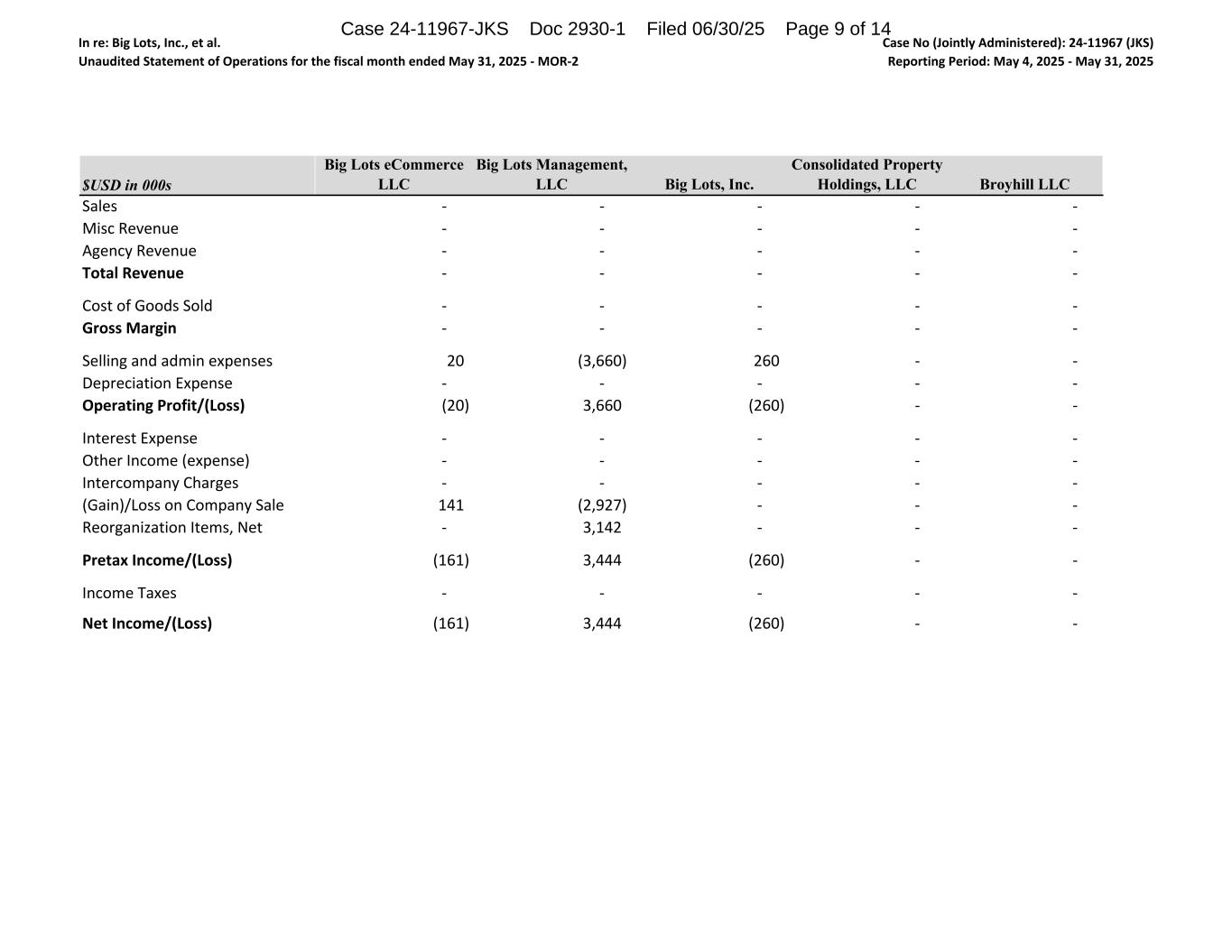 In re: Big Lots, Inc., et al. Unaudited Statement of Operations for the fiscal month ended May 31, 2025 - MOR-2 Case No (Jointly Administered): 24-11967 (JKS) Reporting Period: May 4, 2025 - May 31, 2025 $USD in 000s Sales Misc Revenue Agency Revenue Total Revenue Cost of Goods Sold Gross Margin Selling and admin expenses Depreciation Expense Operating Profit/(Loss) Interest Expense Other Income (expense) Intercompany Charges (Gain)/Loss on Company Sale Reorganization Items, Net Pretax Income/(Loss) Income Taxes Net Income/(Loss) Big Lots eCommerce LLC Big Lots Management, LLC Big Lots, Inc. Consolidated Property Holdings, LLC Broyhill LLC - - - - - - - - - - - - - - - - - - - - - - - - - - - - - - 20 (3,660) 260 - - - - - - - (20) 3,660 (260) - - - - - - - - - - - - - - - - - 141 (2,927) - - - - 3,142 - - - (161) 3,444 (260) - - - - - - - (161) 3,444 (260) - - Case 24-11967-JKS Doc 2930-1 Filed 06/30/25 Page 9 of 14