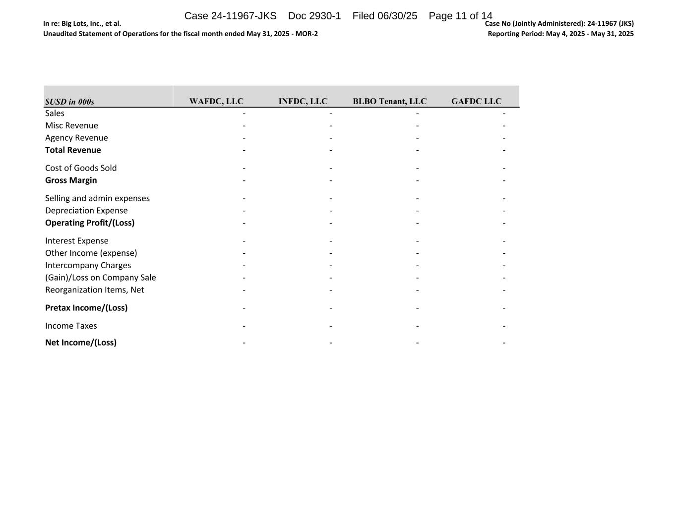 In re: Big Lots, Inc., et al. Unaudited Statement of Operations for the fiscal month ended May 31, 2025 - MOR-2 Case No (Jointly Administered): 24-11967 (JKS) Reporting Period: May 4, 2025 - May 31, 2025 $USD in 000s Sales Misc Revenue Agency Revenue Total Revenue Cost of Goods Sold Gross Margin Selling and admin expenses Depreciation Expense Operating Profit/(Loss) Interest Expense Other Income (expense) Intercompany Charges (Gain)/Loss on Company Sale Reorganization Items, Net Pretax Income/(Loss) Income Taxes Net Income/(Loss) WAFDC, LLC INFDC, LLC BLBO Tenant, LLC GAFDC LLC - - - - - - - - - - - - - - - - - - - - - - - - - - - - - - - - - - - - - - - - - - - - - - - - - - - - - - - - - - - - - - - - - - - - Case 24-11967-JKS Doc 2930-1 Filed 06/30/25 Page 11 of 14
