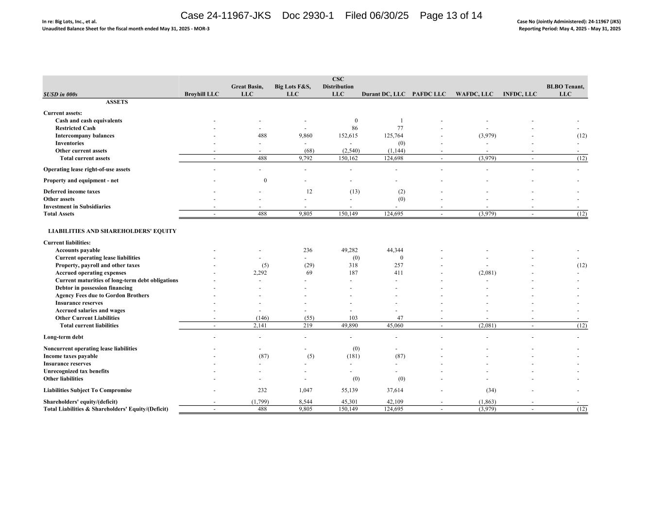 In re: Big Lots, Inc., et al. Unaudited Balance Sheet for the fiscal month ended May 31, 2025 - MOR-3 Case No (Jointly Administered): 24-11967 (JKS) Reporting Period: May 4, 2025 - May 31, 2025 $USD in 000s ASSETS Current assets: Cash and cash equivalents Restricted Cash Intercompany balances Inventories Other current assets Total current assets Operating lease right-of-use assets Property and equipment - net Deferred income taxes Other assets Investment in Subsidiaries Total Assets LIABILITIES AND SHAREHOLDERS' EQUITY Current liabilities: Accounts payable Current operating lease liabilities Property, payroll and other taxes Accrued operating expenses Current maturities of long-term debt obligations Debtor in possession financing Agency Fees due to Gordon Brothers Insurance reserves Accrued salaries and wages Other Current Liabilities Total current liabilities Long-term debt Noncurrent operating lease liabilities Income taxes payable Insurance reserves Unrecognized tax benefits Other liabilities Liabilities Subject To Compromise Shareholders' equity/(deficit) Total Liabilities & Shareholders' Equity/(Deficit) Broyhill LLC Great Basin, LLC Big Lots F&S, LLC CSC Distribution LLC Durant DC, LLC PAFDC LLC WAFDC, LLC INFDC, LLC BLBO Tenant, LLC - - - 0 1 - - - - - - - 86 77 - - - - - 488 9,860 152,615 125,764 - (3,979) - (12) - - - - (0) - - - - - - (68) (2,540) (1,144) - - - - - 488 9,792 150,162 124,698 - (3,979) - (12) - - - - - - - - - - 0 - - - - - - - - - 12 (13) (2) - - - - - - - - (0) - - - - - - - - - - - - - - 488 9,805 150,149 124,695 - (3,979) - (12) - - 236 49,282 44,344 - - - - - - - (0) 0 - - - - - (5) (29) 318 257 - - - (12) - 2,292 69 187 411 - (2,081) - - - - - - - - - - - - - - - - - - - - - - - - - - - - - - - - - - - - - - - - - - - - - - - - (146) (55) 103 47 - - - - - 2,141 219 49,890 45,060 - (2,081) - (12) - - - - - - - - - - - - (0) - - - - - - (87) (5) (181) (87) - - - - - - - - - - - - - - - - - - - - - - - - - (0) (0) - - - - - 232 1,047 55,139 37,614 - (34) - - - (1,799) 8,544 45,301 42,109 - (1,863) - - - 488 9,805 150,149 124,695 - (3,979) - (12) Case 24-11967-JKS Doc 2930-1 Filed 06/30/25 Page 13 of 14
