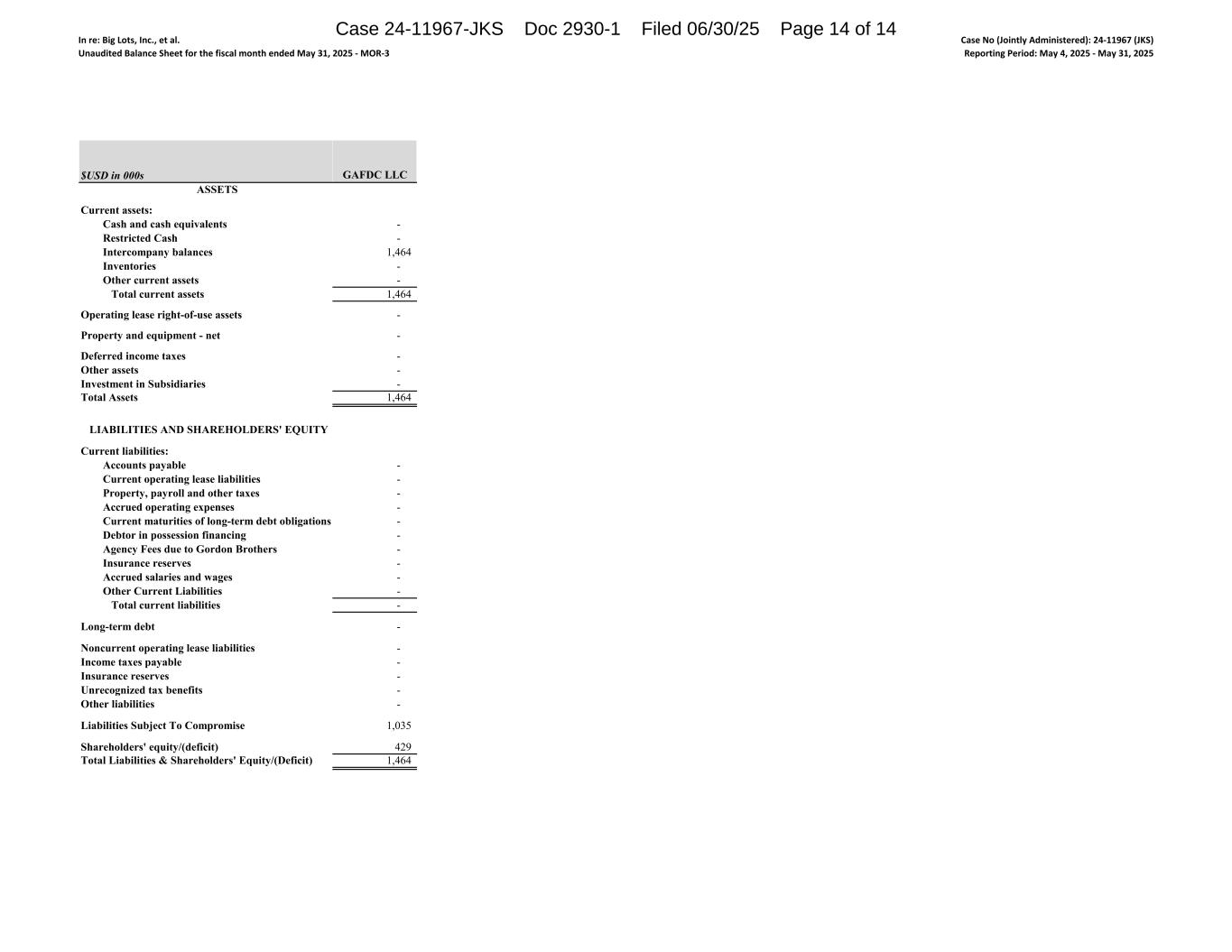 In re: Big Lots, Inc., et al. Unaudited Balance Sheet for the fiscal month ended May 31, 2025 - MOR-3 Case No (Jointly Administered): 24-11967 (JKS) Reporting Period: May 4, 2025 - May 31, 2025 $USD in 000s ASSETS Current assets: Cash and cash equivalents Restricted Cash Intercompany balances Inventories Other current assets Total current assets Operating lease right-of-use assets Property and equipment - net Deferred income taxes Other assets Investment in Subsidiaries Total Assets LIABILITIES AND SHAREHOLDERS' EQUITY Current liabilities: Accounts payable Current operating lease liabilities Property, payroll and other taxes Accrued operating expenses Current maturities of long-term debt obligations Debtor in possession financing Agency Fees due to Gordon Brothers Insurance reserves Accrued salaries and wages Other Current Liabilities Total current liabilities Long-term debt Noncurrent operating lease liabilities Income taxes payable Insurance reserves Unrecognized tax benefits Other liabilities Liabilities Subject To Compromise Shareholders' equity/(deficit) Total Liabilities & Shareholders' Equity/(Deficit) GAFDC LLC - - 1,464 - - 1,464 - - - - - 1,464 - - - - - - - - - - - - - - - - - 1,035 429 1,464 Case 24-11967-JKS Doc 2930-1 Filed 06/30/25 Page 14 of 14