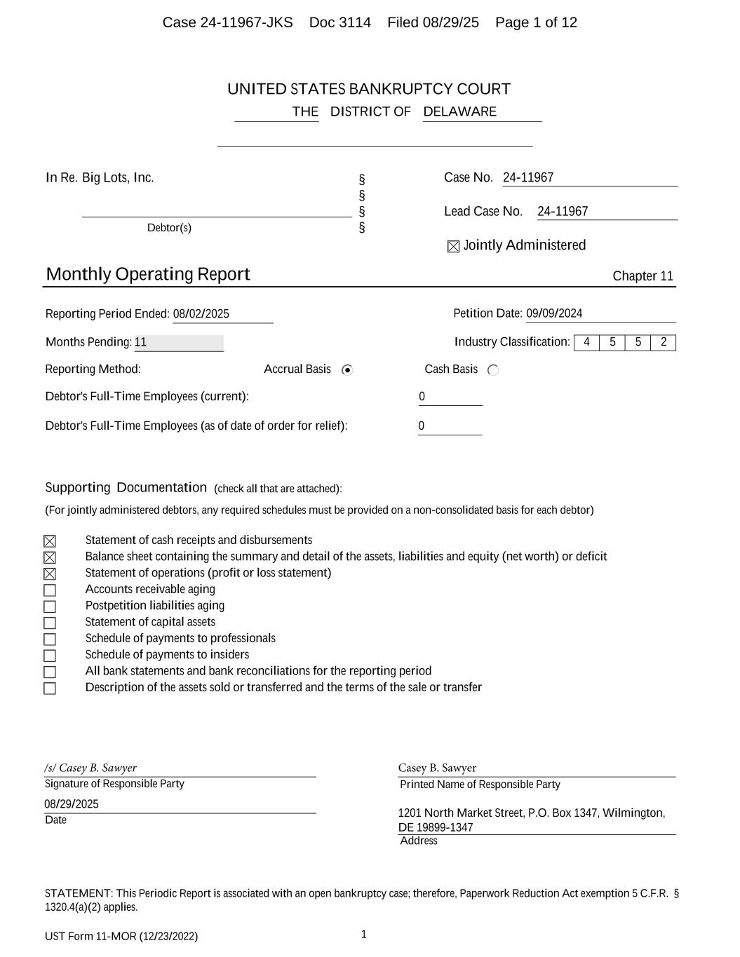 UST Form 11-MOR (12/23/2022) 1 UNITED STATES BANKRUPTCY COURT DISTRICT OFTHE DELAWARE In Re. Big Lots, Inc. Debtor(s) § § § § Case No. 24-11967 Lead Case No. 24-11967 Jointly Administered Monthly Operating Report Chapter 11 Reporting Period Ended: 08/02/2025 Petition Date: 09/09/2024 Months Pending: 11 Industry Classification: 4 5 5 2 Reporting Method: Accrual Basis Cash Basis Debtor's Full-Time Employees (current): 0 Debtor's Full-Time Employees (as of date of order for relief): 0 Supporting Documentation (check all that are attached): (For jointly administered debtors, any required schedules must be provided on a non-consolidated basis for each debtor) Statement of cash receipts and disbursements Balance sheet containing the summary and detail of the assets, liabilities and equity (net worth) or deficit Statement of operations (profit or loss statement) Accounts receivable aging Postpetition liabilities aging Statement of capital assets Schedule of payments to professionals Schedule of payments to insiders All bank statements and bank reconciliations for the reporting period Description of the assets sold or transferred and the terms of the sale or transfer Signature of Responsible Party Printed Name of Responsible Party Date Address /s/ Casey B. Sawyer 08/29/2025 Casey B. Sawyer 1201 North Market Street, P.O. Box 1347, Wilmington, DE 19899-1347 STATEMENT: This Periodic Report is associated with an open bankruptcy case; therefore, Paperwork Reduction Act exemption 5 C.F.R. § 1320.4(a)(2) applies. Case 24-11967-JKS Doc 3114 Filed 08/29/25 Page 1 of 12