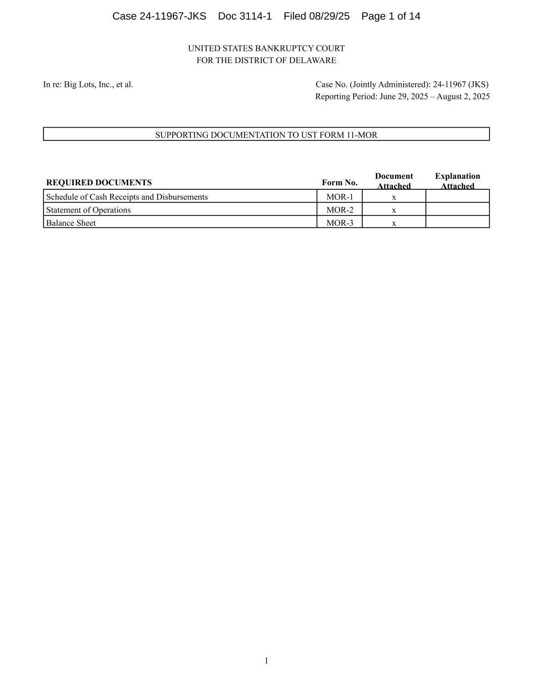 UNITED STATES BANKRUPTCY COURT FOR THE DISTRICT OF DELAWARE In re: Big Lots, Inc., et al. Case No. (Jointly Administered): 24-11967 (JKS) Reporting Period: June 29, 2025 – August 2, 2025 1 SUPPORTING DOCUMENTATION TO UST FORM 11-MOR REQUIRED DOCUMENTS Form No. Document Attached Explanation Attached Schedule of Cash Receipts and Disbursements MOR-1 x Statement of Operations MOR-2 x Balance Sheet MOR-3 x Case 24-11967-JKS Doc 3114-1 Filed 08/29/25 Page 1 of 14