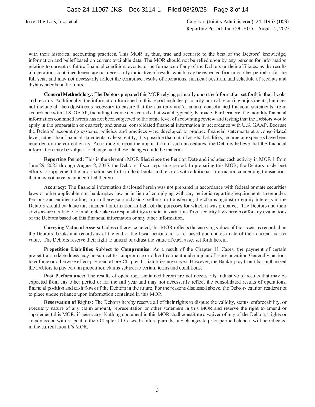 In re: Big Lots, Inc., et al. Case No. (Jointly Administered): 24-11967 (JKS) Reporting Period: June 29, 2025 – August 2, 2025 3 with their historical accounting practices. This MOR is, thus, true and accurate to the best of the Debtors’ knowledge, information and belief based on current available data. The MOR should not be relied upon by any persons for information relating to current or future financial condition, events, or performance of any of the Debtors or their affiliates, as the results of operations contained herein are not necessarily indicative of results which may be expected from any other period or for the full year, and may not necessarily reflect the combined results of operations, financial position, and schedule of receipts and disbursements in the future. General Methodology: The Debtors prepared this MOR relying primarily upon the information set forth in their books and records. Additionally, the information furnished in this report includes primarily normal recurring adjustments, but does not include all the adjustments necessary to ensure that the quarterly and/or annual consolidated financial statements are in accordance with U.S. GAAP, including income tax accruals that would typically be made. Furthermore, the monthly financial information contained herein has not been subjected to the same level of accounting review and testing that the Debtors would apply in the preparation of quarterly and annual consolidated financial information in accordance with U.S. GAAP. Because the Debtors’ accounting systems, policies, and practices were developed to produce financial statements at a consolidated level, rather than financial statements by legal entity, it is possible that not all assets, liabilities, income or expenses have been recorded on the correct entity. Accordingly, upon the application of such procedures, the Debtors believe that the financial information may be subject to change, and these changes could be material. Reporting Period: This is the eleventh MOR filed since the Petition Date and includes cash activity in MOR-1 from June 29, 2025 through August 2, 2025, the Debtors’ fiscal reporting period. In preparing this MOR, the Debtors made best efforts to supplement the information set forth in their books and records with additional information concerning transactions that may not have been identified therein. Accuracy: The financial information disclosed herein was not prepared in accordance with federal or state securities laws or other applicable non-bankruptcy law or in lieu of complying with any periodic reporting requirements thereunder. Persons and entities trading in or otherwise purchasing, selling, or transferring the claims against or equity interests in the Debtors should evaluate this financial information in light of the purposes for which it was prepared. The Debtors and their advisors are not liable for and undertake no responsibility to indicate variations from security laws herein or for any evaluations of the Debtors based on this financial information or any other information. Carrying Value of Assets: Unless otherwise noted, this MOR reflects the carrying values of the assets as recorded on the Debtors’ books and records as of the end of the fiscal period and is not based upon an estimate of their current market value. The Debtors reserve their right to amend or adjust the value of each asset set forth herein. Prepetition Liabilities Subject to Compromise: As a result of the Chapter 11 Cases, the payment of certain prepetition indebtedness may be subject to compromise or other treatment under a plan of reorganization. Generally, actions to enforce or otherwise effect payment of pre-Chapter 11 liabilities are stayed. However, the Bankruptcy Court has authorized the Debtors to pay certain prepetition claims subject to certain terms and conditions. Past Performance: The results of operations contained herein are not necessarily indicative of results that may be expected from any other period or for the full year and may not necessarily reflect the consolidated results of operations, financial position and cash flows of the Debtors in the future. For the reasons discussed above, the Debtors caution readers not to place undue reliance upon information contained in this MOR. Reservation of Rights: The Debtors hereby reserve all of their rights to dispute the validity, status, enforceability, or executory nature of any claim amount, representation or other statement in this MOR and reserve the right to amend or supplement this MOR, if necessary. Nothing contained in this MOR shall constitute a waiver of any of the Debtors’ rights or an admission with respect to their Chapter 11 Cases. In future periods, any changes to prior period balances will be reflected in the current month’s MOR. Case 24-11967-JKS Doc 3114-1 Filed 08/29/25 Page 3 of 14