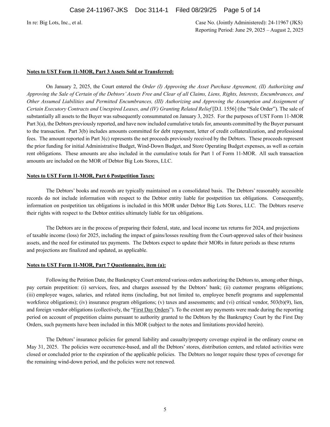 In re: Big Lots, Inc., et al. Case No. (Jointly Administered): 24-11967 (JKS) Reporting Period: June 29, 2025 – August 2, 2025 5 Notes to UST Form 11-MOR, Part 3 Assets Sold or Transferred: On January 2, 2025, the Court entered the Order (I) Approving the Asset Purchase Agreement, (II) Authorizing and Approving the Sale of Certain of the Debtors’ Assets Free and Clear of all Claims, Liens, Rights, Interests, Encumbrances, and Other Assumed Liabilities and Permitted Encumbrances, (III) Authorizing and Approving the Assumption and Assignment of Certain Executory Contracts and Unexpired Leases, and (IV) Granting Related Relief [D.I. 1556] (the “Sale Order”). The sale of substantially all assets to the Buyer was subsequently consummated on January 3, 2025. For the purposes of UST Form 11-MOR Part 3(a), the Debtors previously reported, and have now included cumulative totals for, amounts committed by the Buyer pursuant to the transaction. Part 3(b) includes amounts committed for debt repayment, letter of credit collateralization, and professional fees. The amount reported in Part 3(c) represents the net proceeds previously received by the Debtors. These proceeds represent the prior funding for initial Administrative Budget, Wind-Down Budget, and Store Operating Budget expenses, as well as certain rent obligations. These amounts are also included in the cumulative totals for Part 1 of Form 11-MOR. All such transaction amounts are included on the MOR of Debtor Big Lots Stores, LLC. Notes to UST Form 11-MOR, Part 6 Postpetition Taxes: The Debtors’ books and records are typically maintained on a consolidated basis. The Debtors’ reasonably accessible records do not include information with respect to the Debtor entity liable for postpetition tax obligations. Consequently, information on postpetition tax obligations is included in this MOR under Debtor Big Lots Stores, LLC. The Debtors reserve their rights with respect to the Debtor entities ultimately liable for tax obligations. The Debtors are in the process of preparing their federal, state, and local income tax returns for 2024, and projections of taxable income (loss) for 2025, including the impact of gains/losses resulting from the Court-approved sales of their business assets, and the need for estimated tax payments. The Debtors expect to update their MORs in future periods as these returns and projections are finalized and updated, as applicable. Notes to UST Form 11-MOR, Part 7 Questionnaire, item (a): Following the Petition Date, the Bankruptcy Court entered various orders authorizing the Debtors to, among other things, pay certain prepetition: (i) services, fees, and charges assessed by the Debtors’ bank; (ii) customer programs obligations; (iii) employee wages, salaries, and related items (including, but not limited to, employee benefit programs and supplemental workforce obligations); (iv) insurance program obligations; (v) taxes and assessments; and (vi) critical vendor, 503(b)(9), lien, and foreign vendor obligations (collectively, the “First Day Orders”). To the extent any payments were made during the reporting period on account of prepetition claims pursuant to authority granted to the Debtors by the Bankruptcy Court by the First Day Orders, such payments have been included in this MOR (subject to the notes and limitations provided herein). The Debtors’ insurance policies for general liability and casualty/property coverage expired in the ordinary course on May 31, 2025. The policies were occurrence-based, and all the Debtors’ stores, distribution centers, and related activities were closed or concluded prior to the expiration of the applicable policies. The Debtors no longer require these types of coverage for the remaining wind-down period, and the policies were not renewed. Case 24-11967-JKS Doc 3114-1 Filed 08/29/25 Page 5 of 14