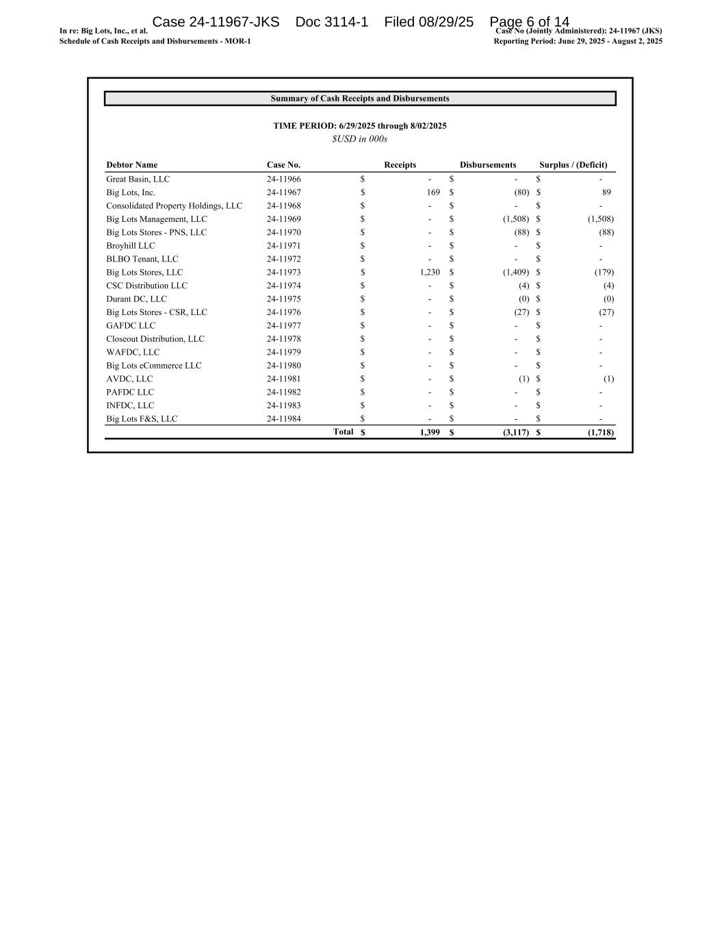 In re: Big Lots, Inc., et al. Schedule of Cash Receipts and Disbursements - MOR-1 Case No (Jointly Administered): 24-11967 (JKS) Reporting Period: June 29, 2025 - August 2, 2025 Summary of Cash Receipts and Disbursements TIME PERIOD: 6/29/2025 through 8/02/2025 Debtor Name Case No. Receipts Disbursements Surplus / (Deficit) Great Basin, LLC 24-11966 -$ -$ -$ Big Lots, Inc. 24-11967 169$ (80)$ 89$ Consolidated Property Holdings, LLC 24-11968 -$ -$ -$ Big Lots Management, LLC 24-11969 -$ (1,508)$ (1,508)$ Big Lots Stores - PNS, LLC 24-11970 -$ (88)$ (88)$ Broyhill LLC 24-11971 -$ -$ -$ BLBO Tenant, LLC 24-11972 -$ -$ -$ Big Lots Stores, LLC 24-11973 1,230$ (1,409)$ (179)$ CSC Distribution LLC 24-11974 -$ (4)$ (4)$ Durant DC, LLC 24-11975 -$ (0)$ (0)$ Big Lots Stores - CSR, LLC 24-11976 -$ (27)$ (27)$ GAFDC LLC 24-11977 -$ -$ -$ Closeout Distribution, LLC 24-11978 -$ -$ -$ WAFDC, LLC 24-11979 -$ -$ -$ Big Lots eCommerce LLC 24-11980 -$ -$ -$ AVDC, LLC 24-11981 -$ (1)$ (1)$ PAFDC LLC 24-11982 -$ -$ -$ INFDC, LLC 24-11983 -$ -$ -$ Big Lots F&S, LLC 24-11984 -$ -$ -$ Total 1,399$ (3,117)$ (1,718)$ $USD in 000s Case 24-11967-JKS Doc 3114-1 Filed 08/29/25 Page 6 of 14