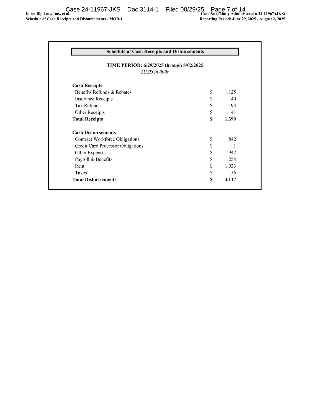 In re: Big Lots, Inc., et al. Schedule of Cash Receipts and Disbursements - MOR-1 Case No (Jointly Administered): 24-11967 (JKS) Reporting Period: June 29, 2025 - August 2, 2025 Schedule of Cash Receipts and Disbursements TIME PERIOD: 6/29/2025 through 8/02/2025 Cash Receipts Benefits Refunds & Rebates 1,125$ Insurance Receipts 40$ Tax Refunds 193$ Other Receipts 41$ Total Receipts 1,399$ Cash Disbursements Contract Workforce Obligations 842$ Credit Card Processor Obligations 1$ Other Expenses 942$ Payroll & Benefits 254$ Rent 1,023$ Taxes 56$ Total Disbursements 3,117$ $USD in 000s Case 24-11967-JKS Doc 3114-1 Filed 08/29/25 Page 7 of 14
