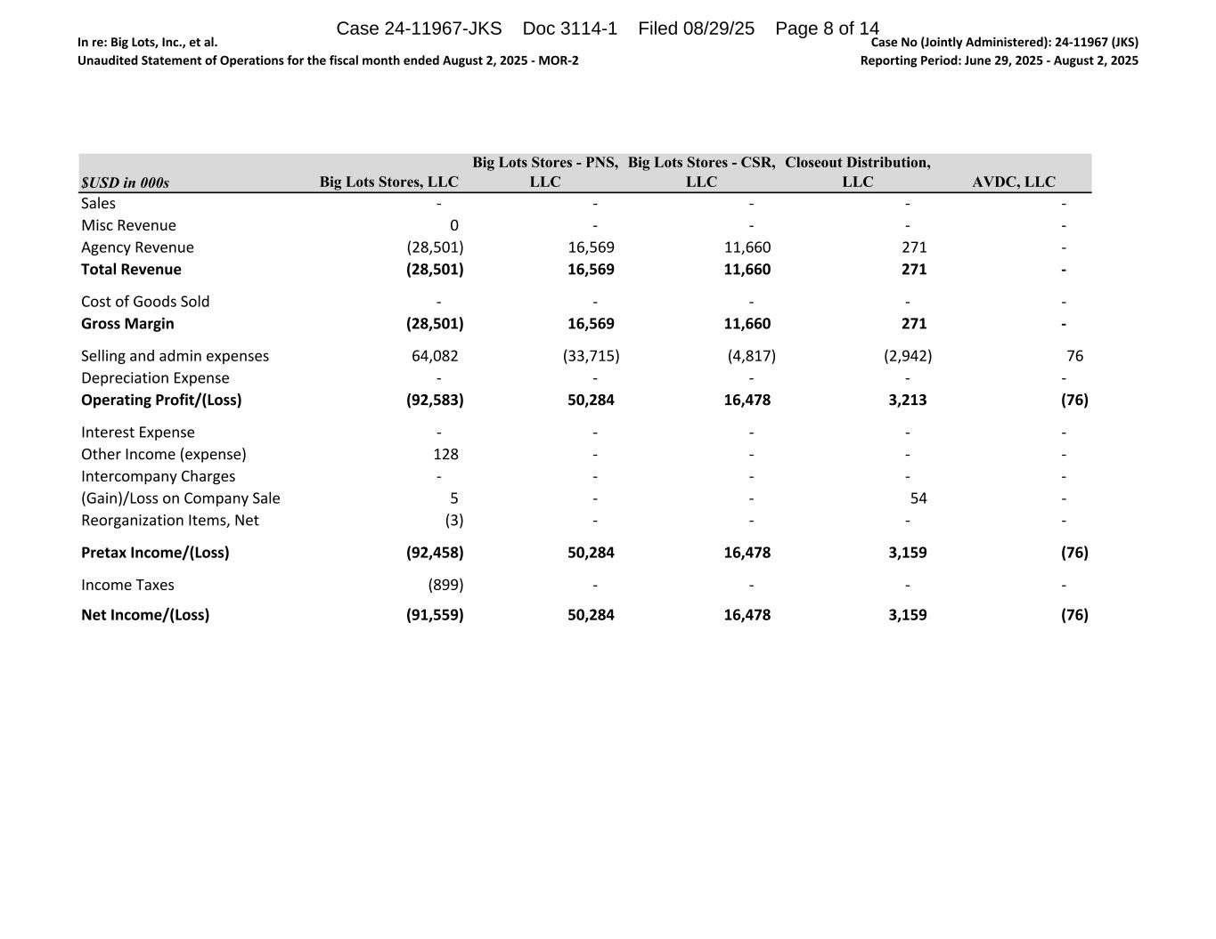 In re: Big Lots, Inc., et al. Unaudited Statement of Operations for the fiscal month ended August 2, 2025 - MOR-2 Case No (Jointly Administered): 24-11967 (JKS) Reporting Period: June 29, 2025 - August 2, 2025 $USD in 000s Big Lots Stores, LLC Big Lots Stores - PNS, LLC Big Lots Stores - CSR, LLC Closeout Distribution, LLC AVDC, LLC Sales - - - - - Misc Revenue 0 - - - - Agency Revenue (28,501) 16,569 11,660 271 - Total Revenue (28,501) 16,569 11,660 271 - Cost of Goods Sold - - - - - Gross Margin (28,501) 16,569 11,660 271 - Selling and admin expenses 64,082 (33,715) (4,817) (2,942) 76 Depreciation Expense - - - - - Operating Profit/(Loss) (92,583) 50,284 16,478 3,213 (76) Interest Expense - - - - - Other Income (expense) 128 - - - - Intercompany Charges - - - - - (Gain)/Loss on Company Sale 5 - - 54 - Reorganization Items, Net (3) - - - - Pretax Income/(Loss) (92,458) 50,284 16,478 3,159 (76) Income Taxes (899) - - - - Net Income/(Loss) (91,559) 50,284 16,478 3,159 (76) Case 24-11967-JKS Doc 3114-1 Filed 08/29/25 Page 8 of 14