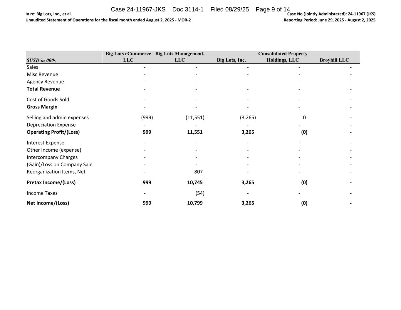 In re: Big Lots, Inc., et al. Unaudited Statement of Operations for the fiscal month ended August 2, 2025 - MOR-2 Case No (Jointly Administered): 24-11967 (JKS) Reporting Period: June 29, 2025 - August 2, 2025 $USD in 000s Sales Misc Revenue Agency Revenue Total Revenue Cost of Goods Sold Gross Margin Selling and admin expenses Depreciation Expense Operating Profit/(Loss) Interest Expense Other Income (expense) Intercompany Charges (Gain)/Loss on Company Sale Reorganization Items, Net Pretax Income/(Loss) Income Taxes Net Income/(Loss) Big Lots eCommerce LLC Big Lots Management, LLC Big Lots, Inc. Consolidated Property Holdings, LLC Broyhill LLC - - - - - - - - - - - - - - - - - - - - - - - - - - - - - - (999) (11,551) (3,265) 0 - - - - - - 999 11,551 3,265 (0) - - - - - - - - - - - - - - - - - - - - - - 807 - - - 999 10,745 3,265 (0) - - (54) - - - 999 10,799 3,265 (0) - Case 24-11967-JKS Doc 3114-1 Filed 08/29/25 Page 9 of 14