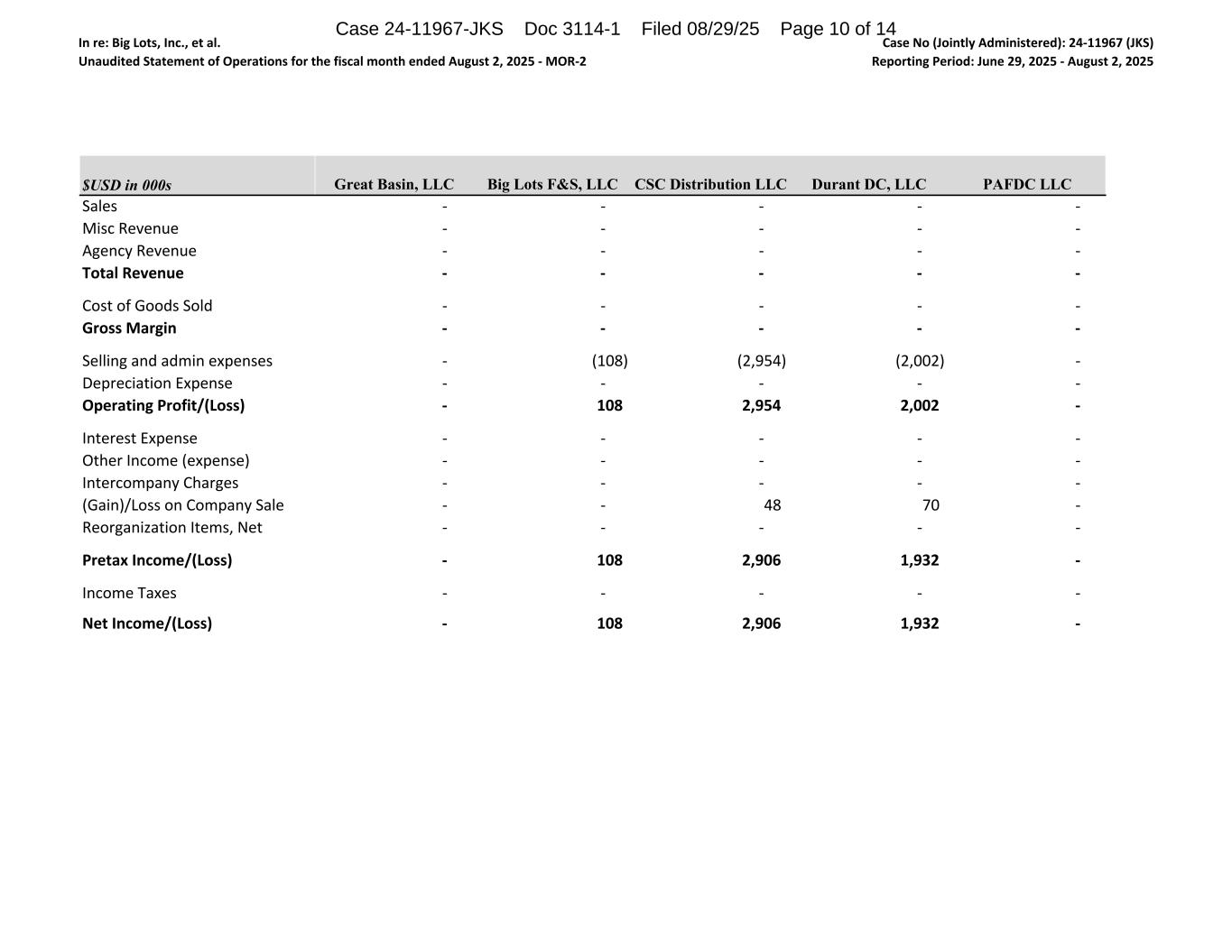 In re: Big Lots, Inc., et al. Unaudited Statement of Operations for the fiscal month ended August 2, 2025 - MOR-2 Case No (Jointly Administered): 24-11967 (JKS) Reporting Period: June 29, 2025 - August 2, 2025 $USD in 000s Sales Misc Revenue Agency Revenue Total Revenue Cost of Goods Sold Gross Margin Selling and admin expenses Depreciation Expense Operating Profit/(Loss) Interest Expense Other Income (expense) Intercompany Charges (Gain)/Loss on Company Sale Reorganization Items, Net Pretax Income/(Loss) Income Taxes Net Income/(Loss) Great Basin, LLC Big Lots F&S, LLC CSC Distribution LLC Durant DC, LLC PAFDC LLC - - - - - - - - - - - - - - - - - - - - - - - - - - - - - - - (108) (2,954) (2,002) - - - - - - - 108 2,954 2,002 - - - - - - - - - - - - - - - - - - 48 70 - - - - - - - 108 2,906 1,932 - - - - - - - 108 2,906 1,932 - Case 24-11967-JKS Doc 3114-1 Filed 08/29/25 Page 10 of 14
