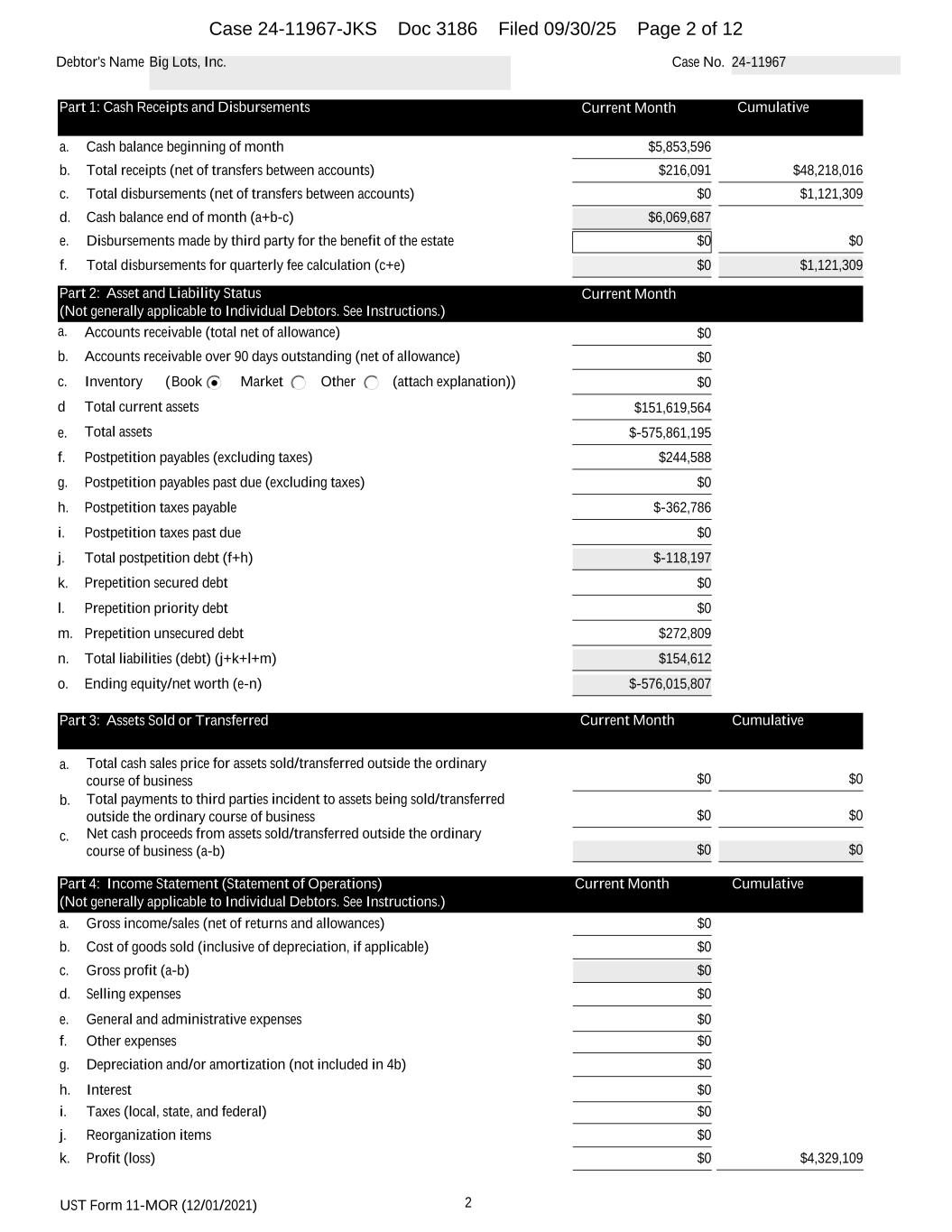 UST Form 11-MOR (12/01/2021) 2 Debtor's Name Big Lots, Inc. Case No. 24-11967 Part 1: Cash Receipts and Disbursements Current Month Cumulative a. Cash balance beginning of month $5,853,596 b. Total receipts (net of transfers between accounts) $216,091 $48,218,016 c. Total disbursements (net of transfers between accounts) $0 $1,121,309 d. Cash balance end of month (a+b-c) $6,069,687 e. Disbursements made by third party for the benefit of the estate $0 $0 f. Total disbursements for quarterly fee calculation (c+e) $0 $1,121,309 Part 2: Asset and Liability Status Current Month (Not generally applicable to Individual Debtors. See Instructions.) a. Accounts receivable (total net of allowance) $0 b. Accounts receivable over 90 days outstanding (net of allowance) $0 c. Inventory ( (attach explanation))Book Market Other $0 d Total current assets $151,619,564 e. Total assets $-575,861,195 f. Postpetition payables (excluding taxes) $244,588 g. Postpetition payables past due (excluding taxes) $0 h. Postpetition taxes payable $-362,786 i. Postpetition taxes past due $0 j. Total postpetition debt (f+h) $-118,197 k. Prepetition secured debt $0 l. Prepetition priority debt $0 m. Prepetition unsecured debt $272,809 n. Total liabilities (debt) (j+k+l+m) $154,612 o. Ending equity/net worth (e-n) $-576,015,807 Part 3: Assets Sold or Transferred Current Month Cumulative a. Total cash sales price for assets sold/transferred outside the ordinary course of business $0 $0 b. Total payments to third parties incident to assets being sold/transferred outside the ordinary course of business $0 $0 c. Net cash proceeds from assets sold/transferred outside the ordinary course of business (a-b) $0 $0 Part 4: Income Statement (Statement of Operations) Current Month Cumulative (Not generally applicable to Individual Debtors. See Instructions.) a. Gross income/sales (net of returns and allowances) $0 b. Cost of goods sold (inclusive of depreciation, if applicable) $0 c. Gross profit (a-b) $0 d. Selling expenses $0 e. General and administrative expenses $0 f. Other expenses $0 g. Depreciation and/or amortization (not included in 4b) $0 h. Interest $0 i. Taxes (local, state, and federal) $0 j. Reorganization items $0 k. Profit (loss) $0 $4,329,109 Case 24-11967-JKS Doc 3186 Filed 09/30/25 Page 2 of 12